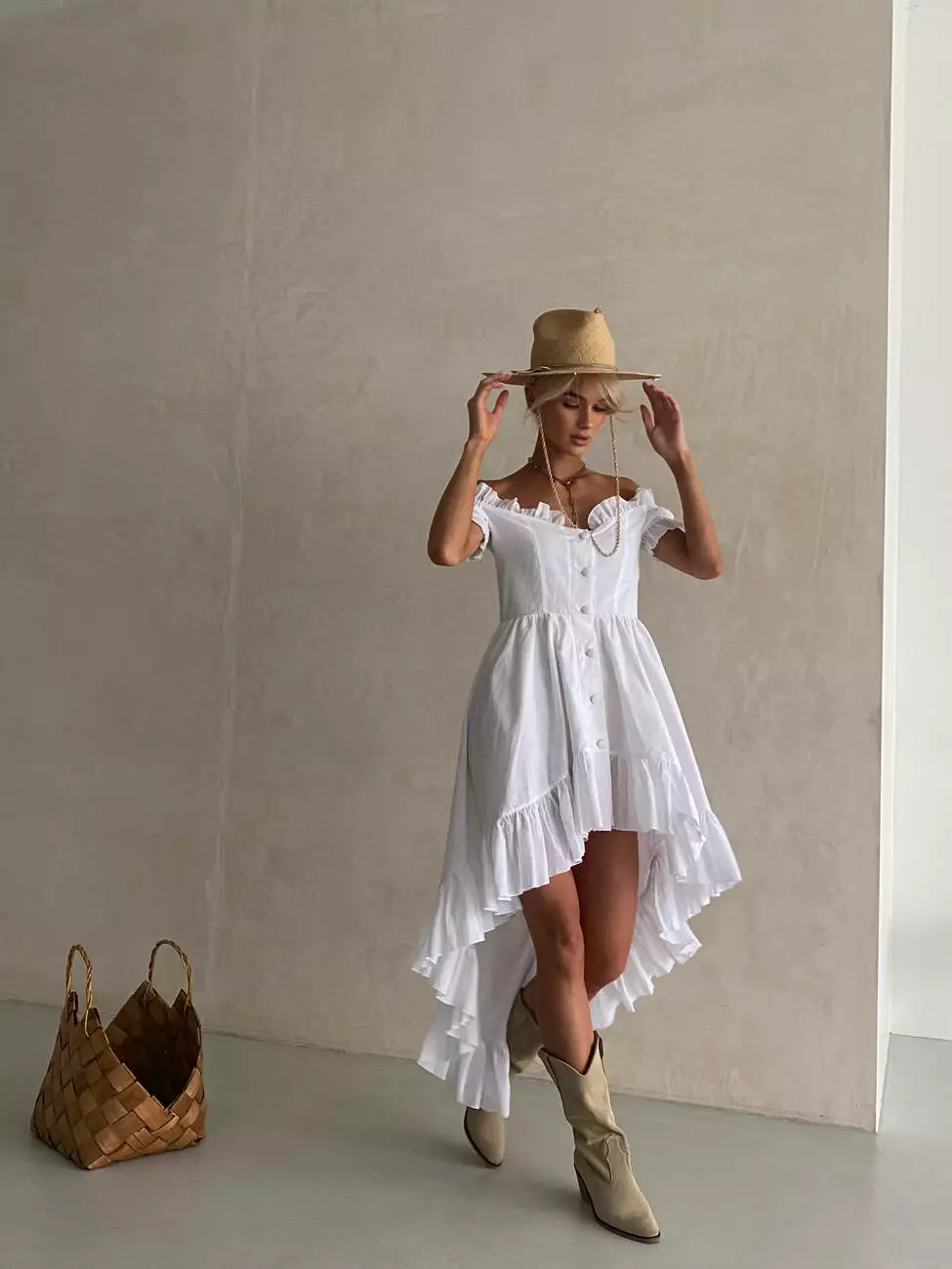 Ніжна сукня MIRANDA в романтичному стилі з відкритими плечима з легкої бавовни, що робить акцент на ніжках, максимально підкреслюючи жіночність.