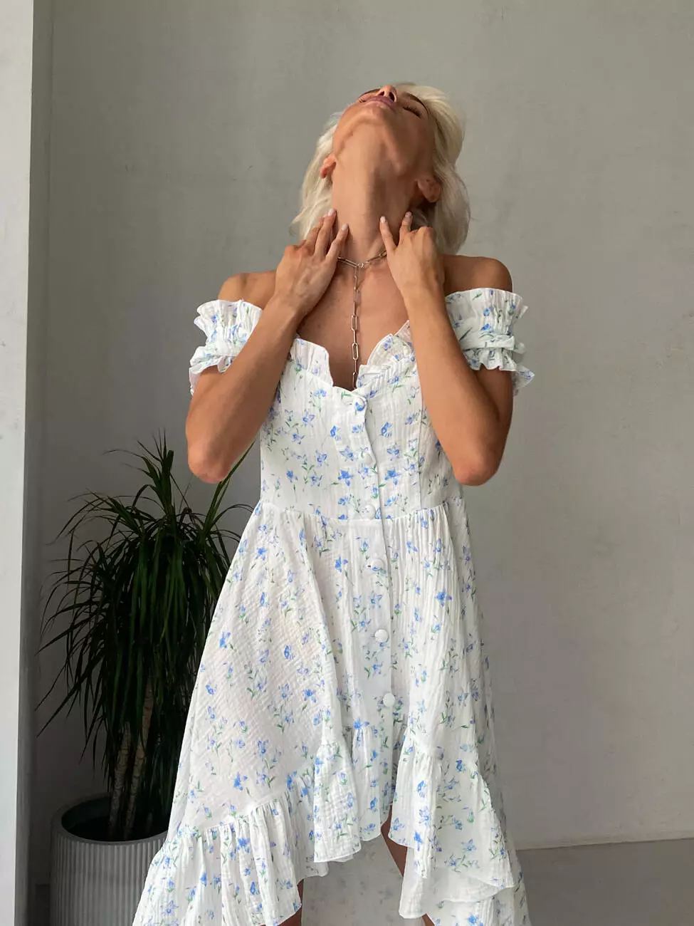 Ніжна сукня MIRANDA в романтичному стилі з відкритими плечима з легкої бавовни, що робить акцент на ніжках, максимально підкреслюючи жіночність.