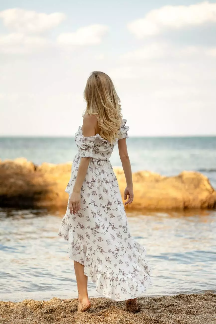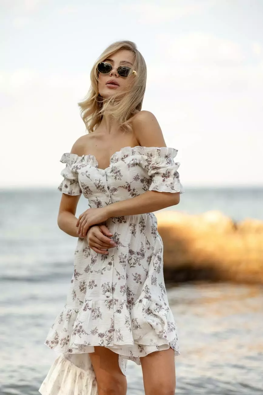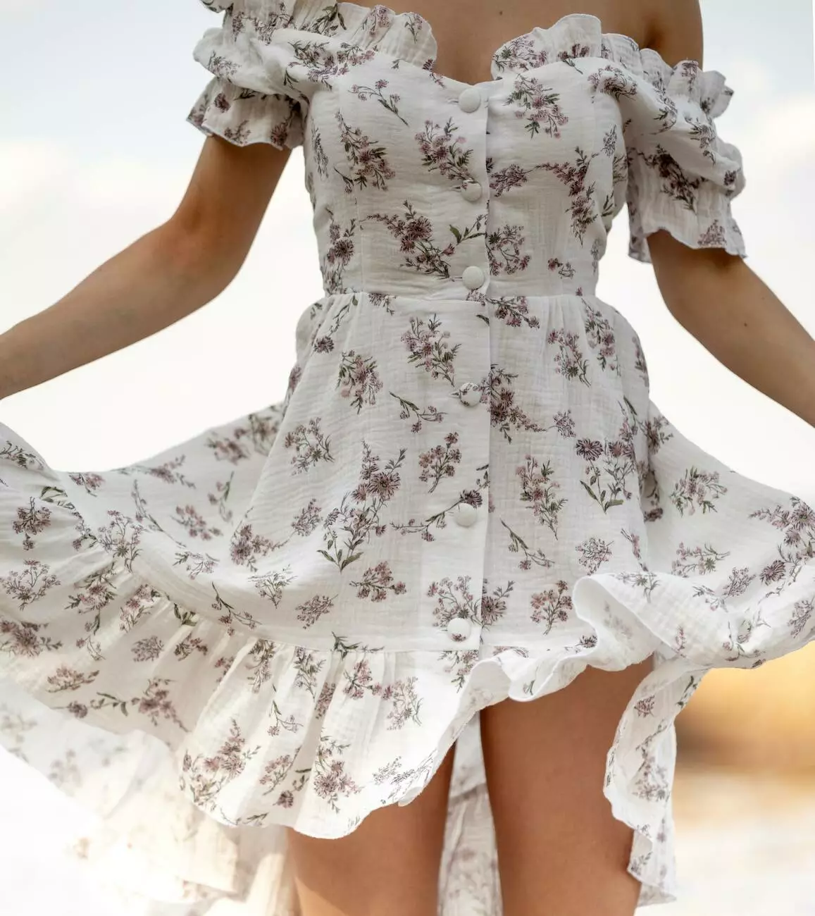 Ніжна сукня MIRANDA в романтичному стилі з відкритими плечима з легкої бавовни, що робить акцент на ніжках, максимально підкреслюючи жіночність.