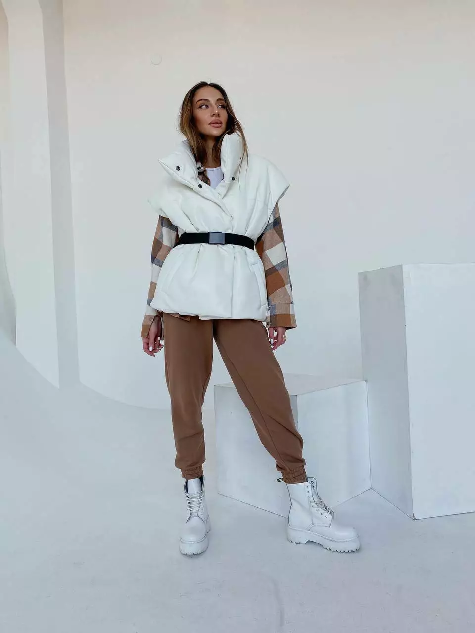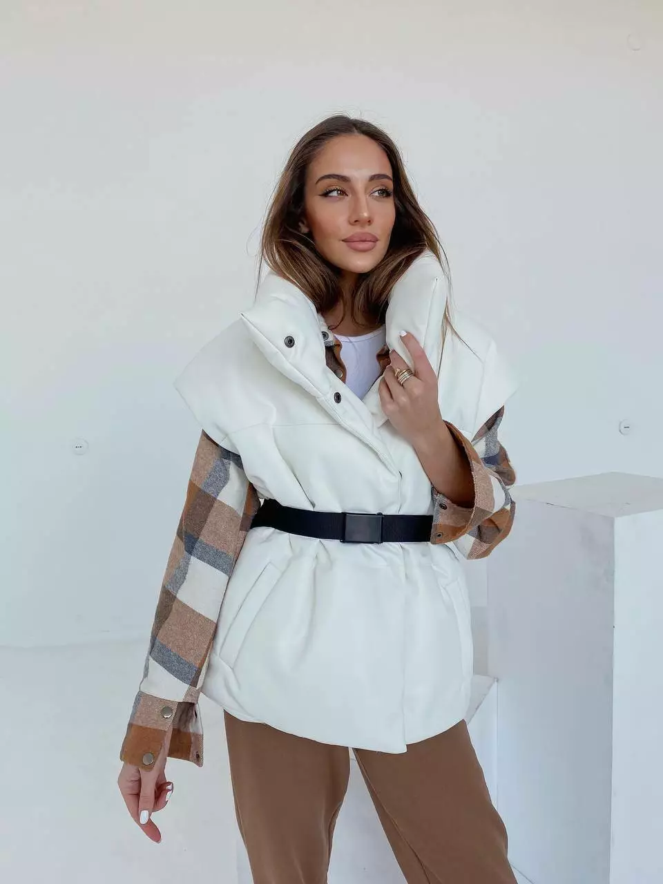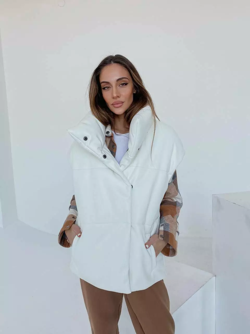 Демісезонний трендовий жилет Desing з екошкіри утеплювач силікон 200 білого кольору
