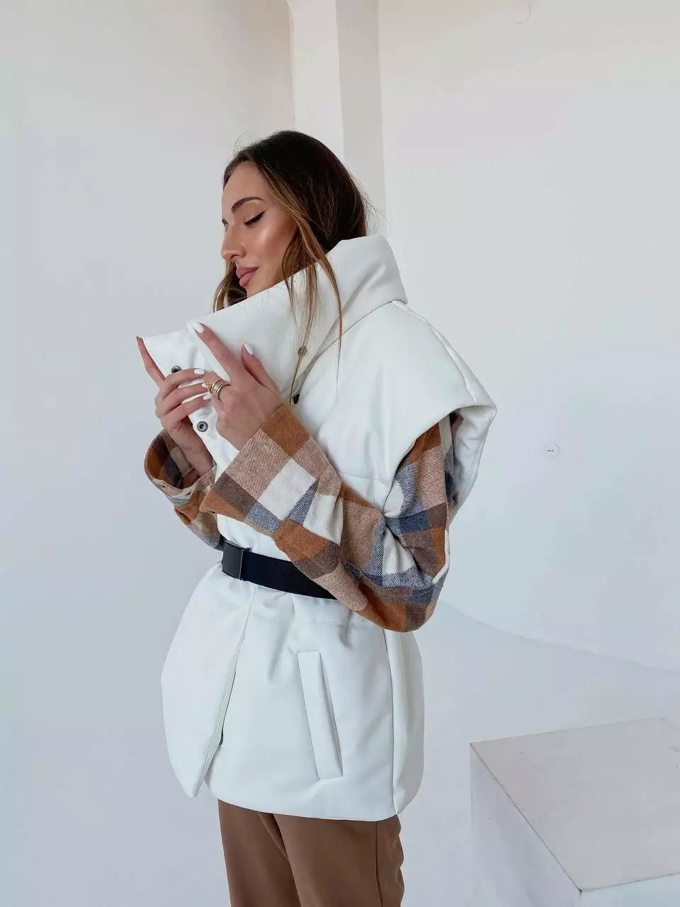 Демісезонний трендовий жилет з екошкіри внесе різноманітність у повсякденний образ восени та навесні.