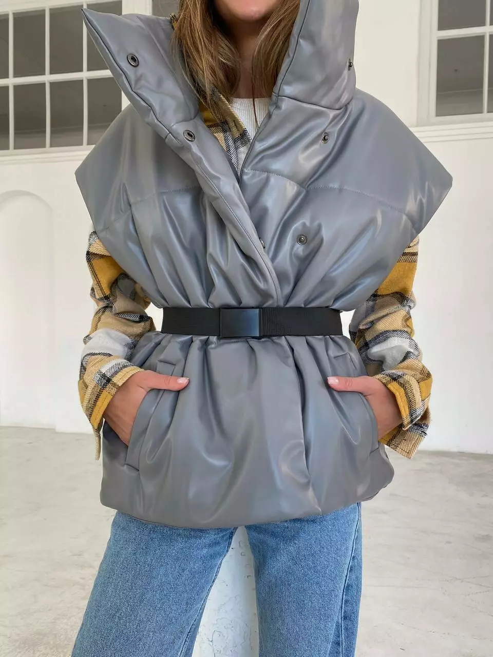 Демісезонний трендовий жилет з екошкіри внесе різноманітність у повсякденний образ восени та навесні.