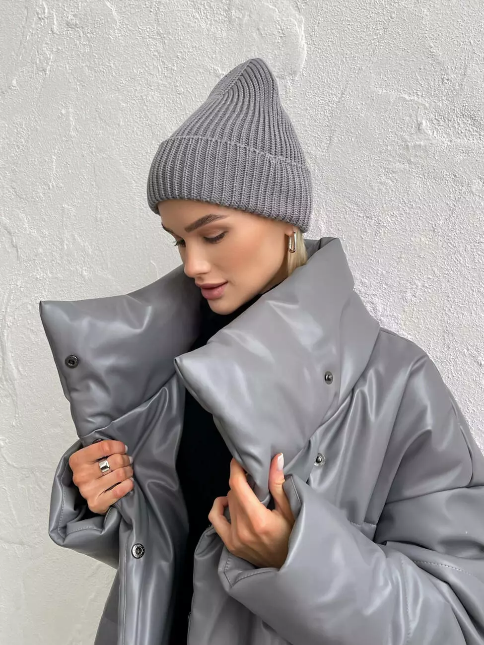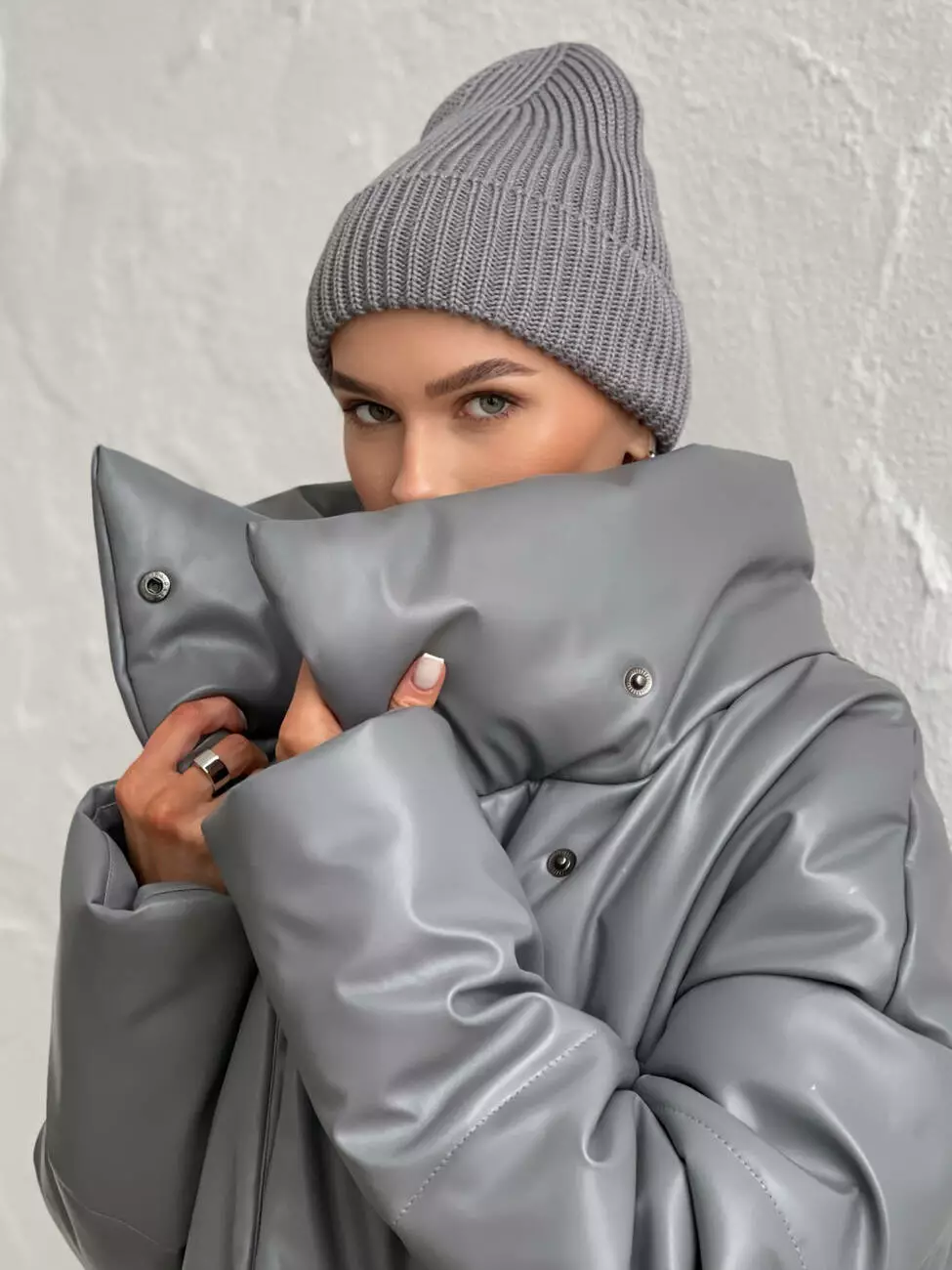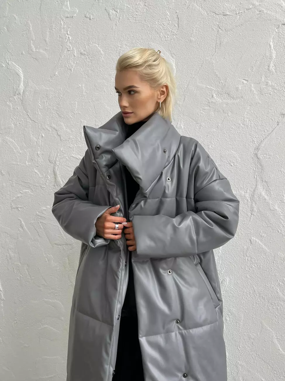 Довга жіноча зимова куртка - пуховик NIKA з екошкіри класу Lux на силіконі 200 без капюшона сірого кольору