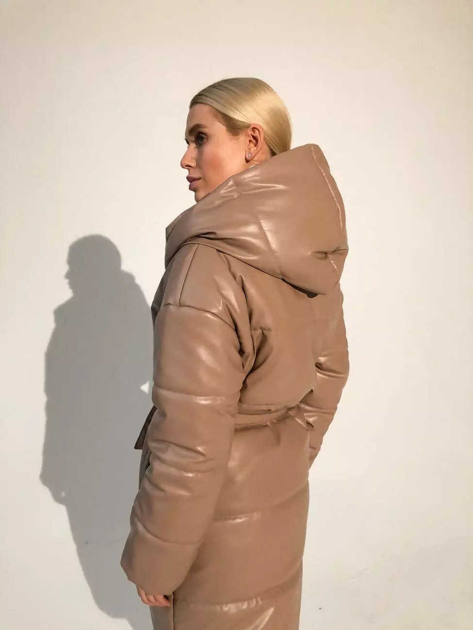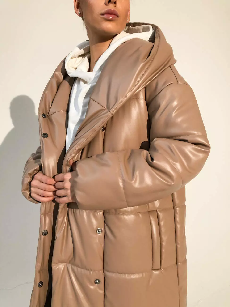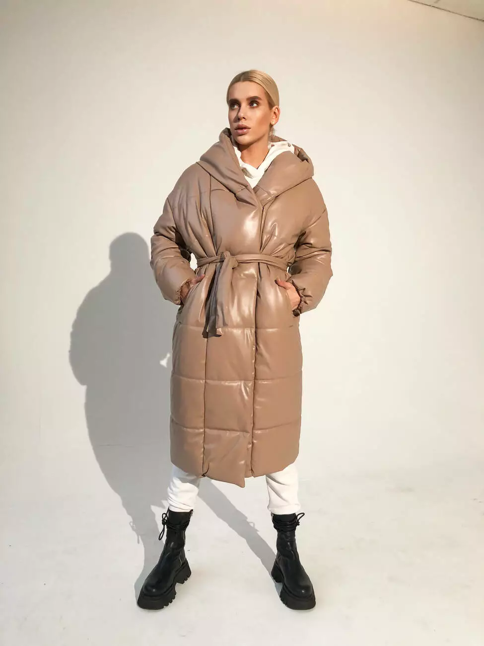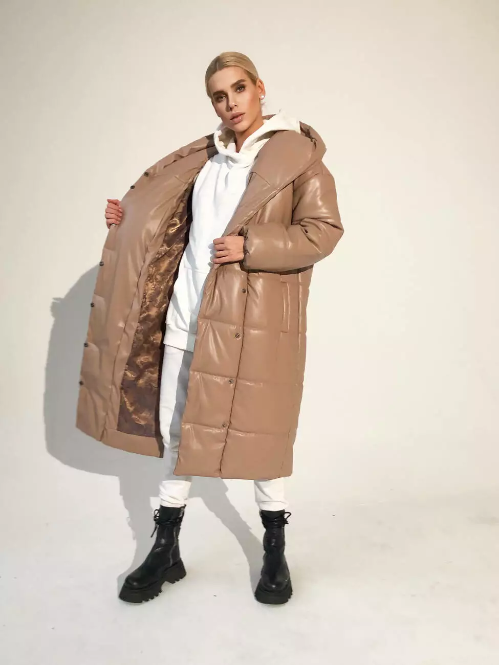 Довга жіноча зимова куртка - пуховик ZEFIR з екошкіри класу Lux на силіконі 200 з капюшоном бежевого кольору