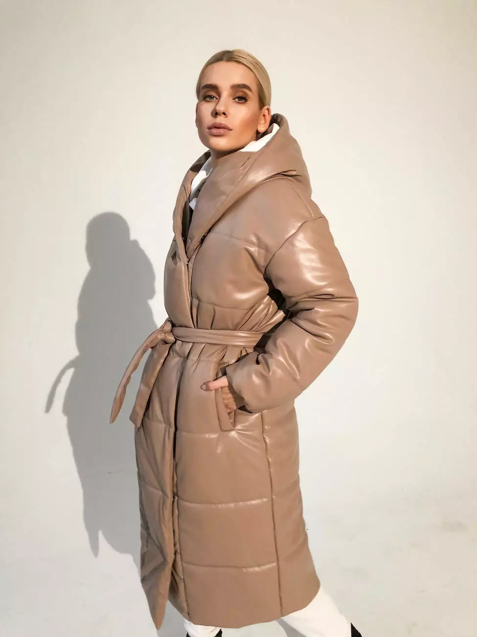 Довгий жіночий пуховик з екошкіри класу Lux з капюшоном забезпечить не тільки безкомпромісне тепло, комфорт у сніг та дощ, мороз та вітер, але й гарантує стильний зовнішній вигляд, що відповідає останнім модним трендам.