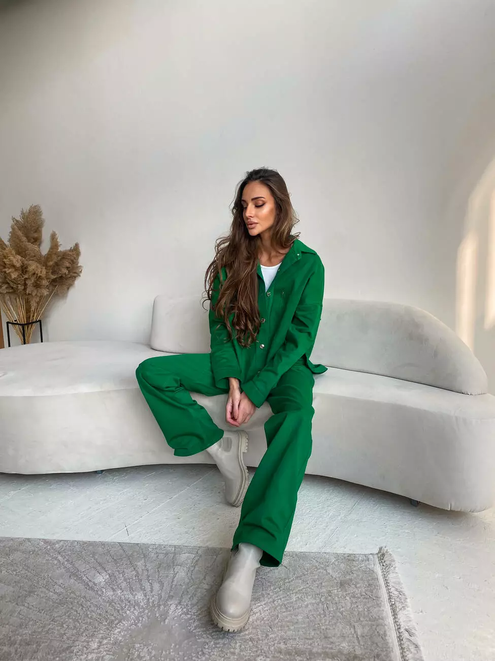 Сорочка подовжена та має дві накладні кишені, застібається на ґудзики, штани прямого крою та високої посадки.