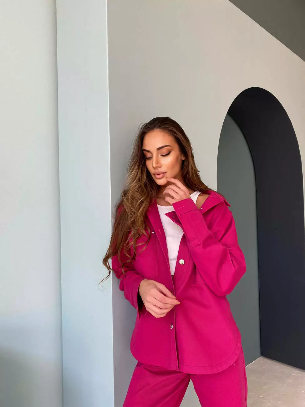 Сорочка подовжена та має дві накладні кишені, застібається на ґудзики, штани прямого крою та високої посадки.