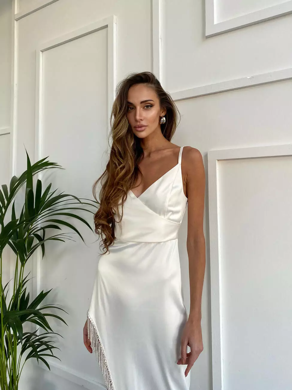 Ефектна сукня CALYPSO з королівского атласу та бахромою зі страз молочного кольору