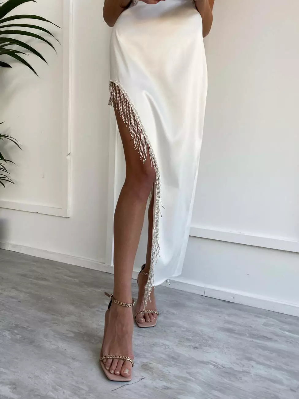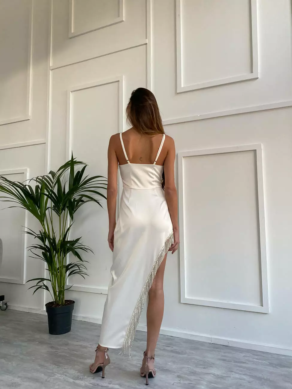 Родзинка сукні - це високий виріз декорований вручну бахромою зі страз, який повністю відкриває ногу.