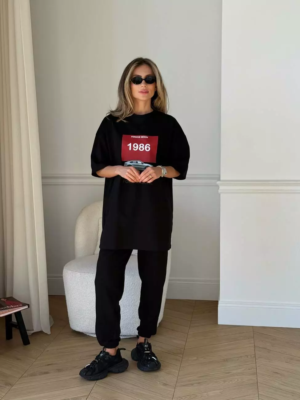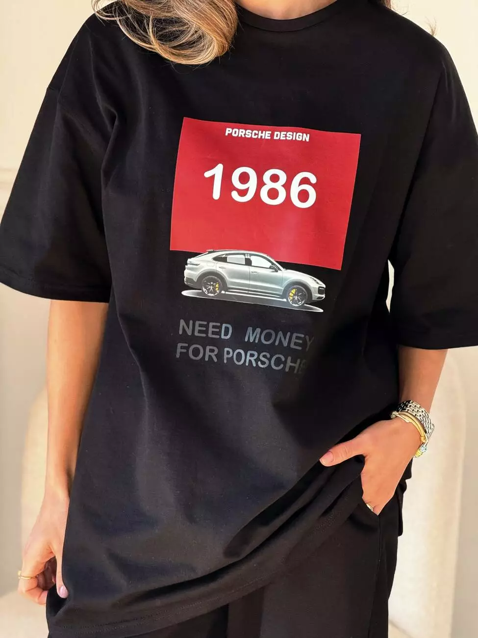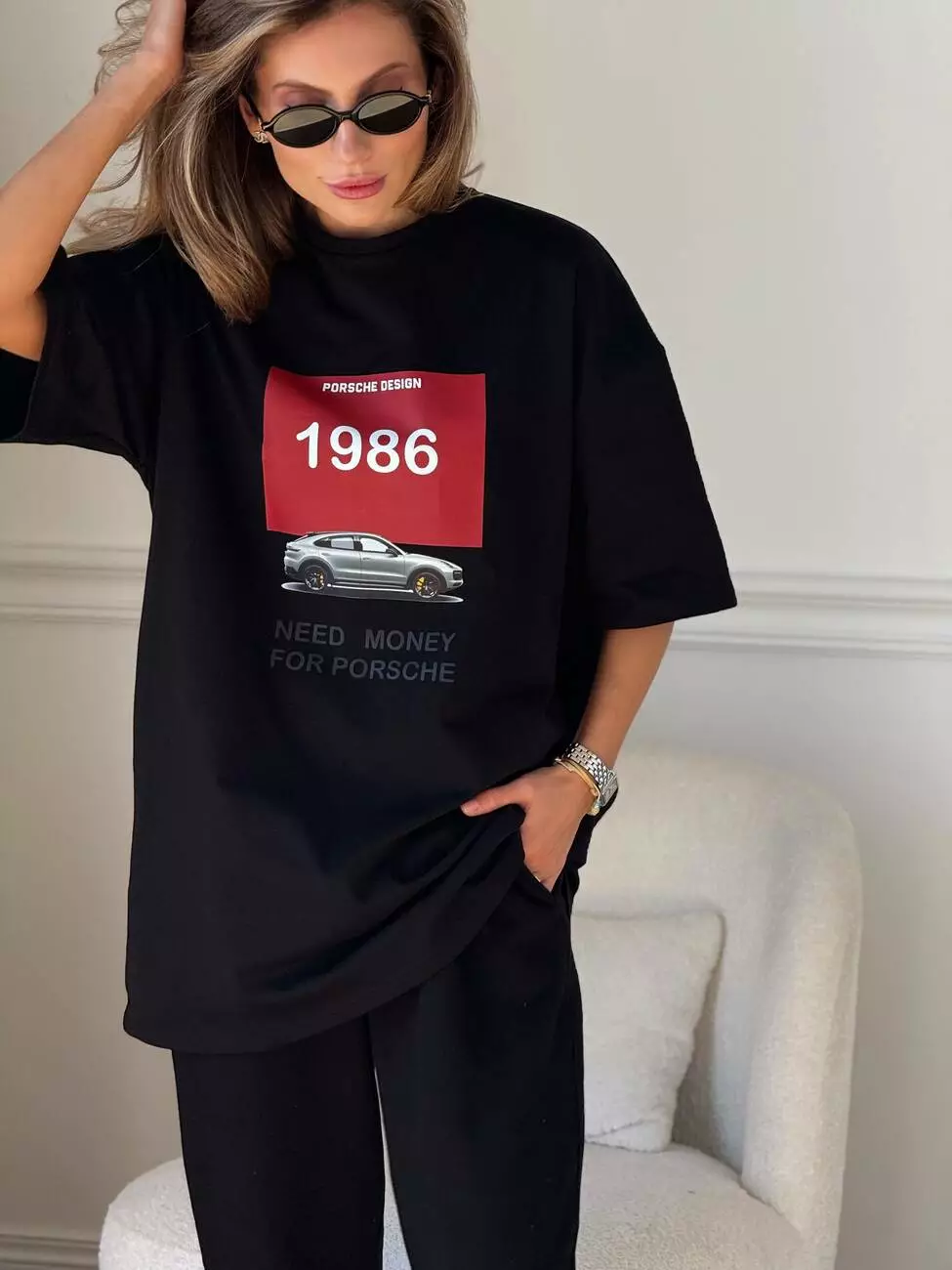 Широка футболка формат “over size” зі стильним принтом у вигляді порше.