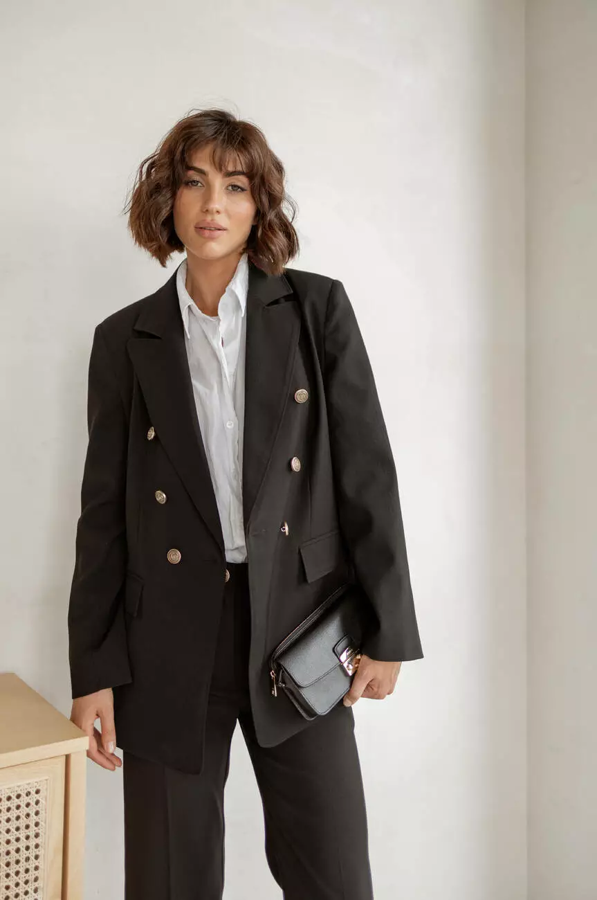 Модель складається з подовженого піджака на підкладці та штани прямого крою, які чудово сидять.