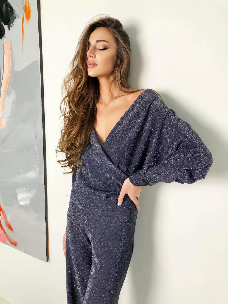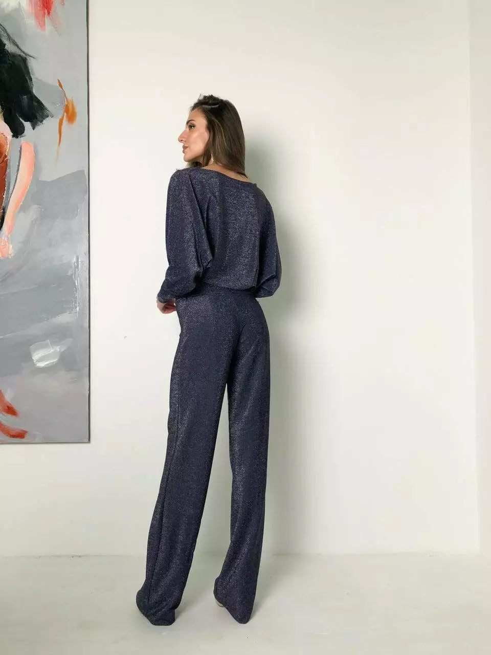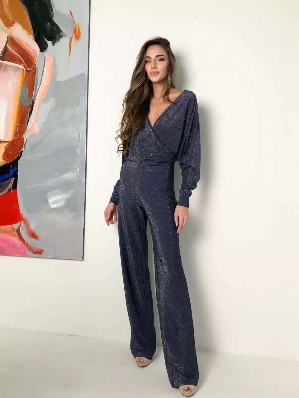 М'який, стрейчевий комбінезон із люрексу, має верх імітація запаху та штани клеш від стегна Суцільний комбінезон надає гламурного настрою та застібається потайною блискавкою на боці