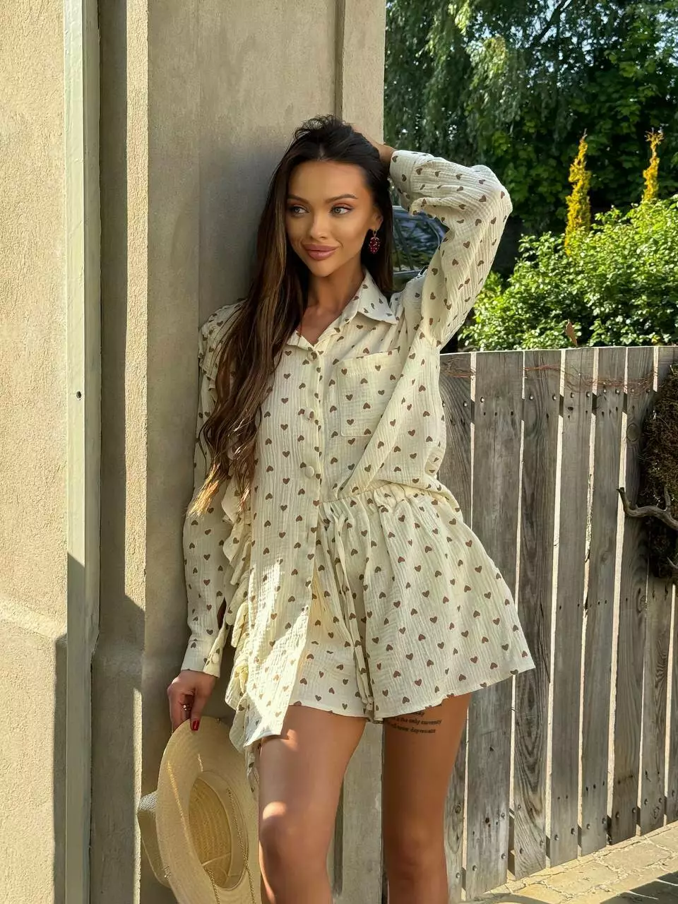 Сорочка вільного крою з довгим рукавом та шортики на гумці, з кишенями.