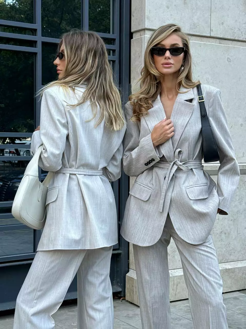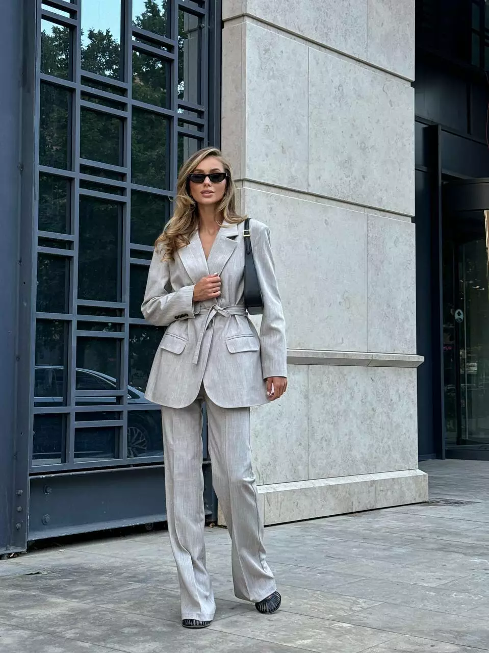 Стильний класичний костюм, під пояс Піджак з чоловічого плеча, прямого крою Брюки прямого крою, на трохи заниженій посадці. Пояс шнурок в комплекті. Тканина : преміальна костюмка