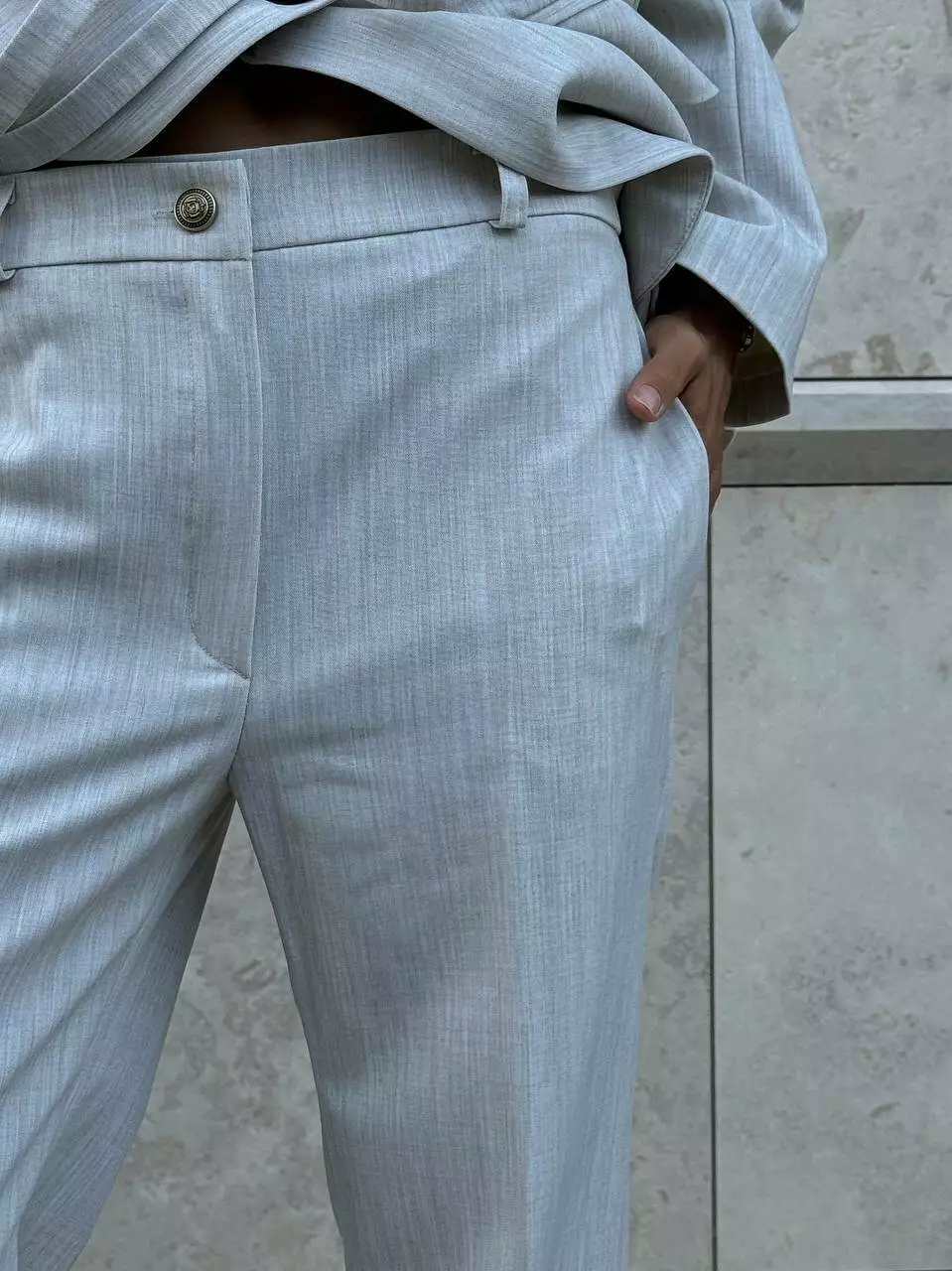 Стильний класичний костюм, під пояс Піджак з чоловічого плеча, прямого крою Брюки прямого крою, на трохи заниженій посадці. Пояс шнурок в комплекті. Тканина : преміальна костюмка
