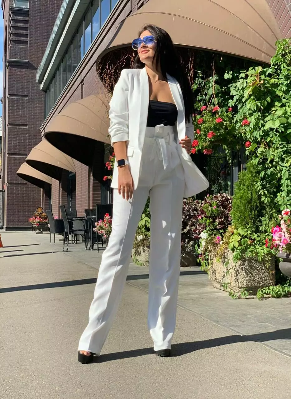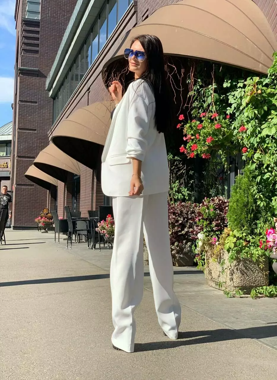 Стильний класичний костюм з тендовими штанами-трубами високої посадки та дуже ефектним піджаком з рукавами 3/4