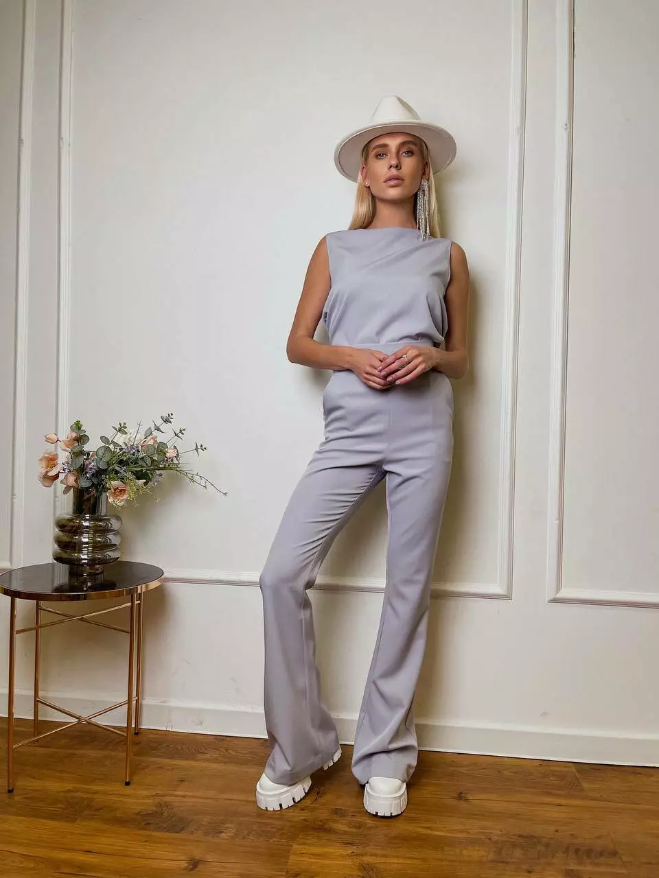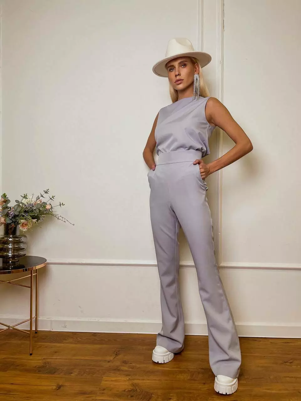 Однотонний комплект LOLA - це ідеальний варіант для стильного та модного вигляду Мінімалістичний та оригінальний костюм складається із топа, який має ідеальну посадку по грудях та вільний в талії, без кишень та застібок Штани мають високу посадку, яка ідеально підкреслить фігуру та клеш від коліна, бічні робочі кишені, застібаються штани на потайну блискавку позаду.