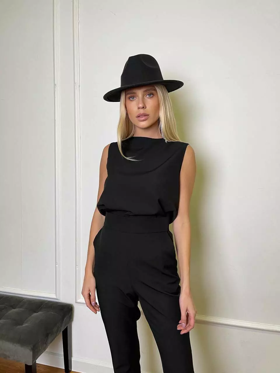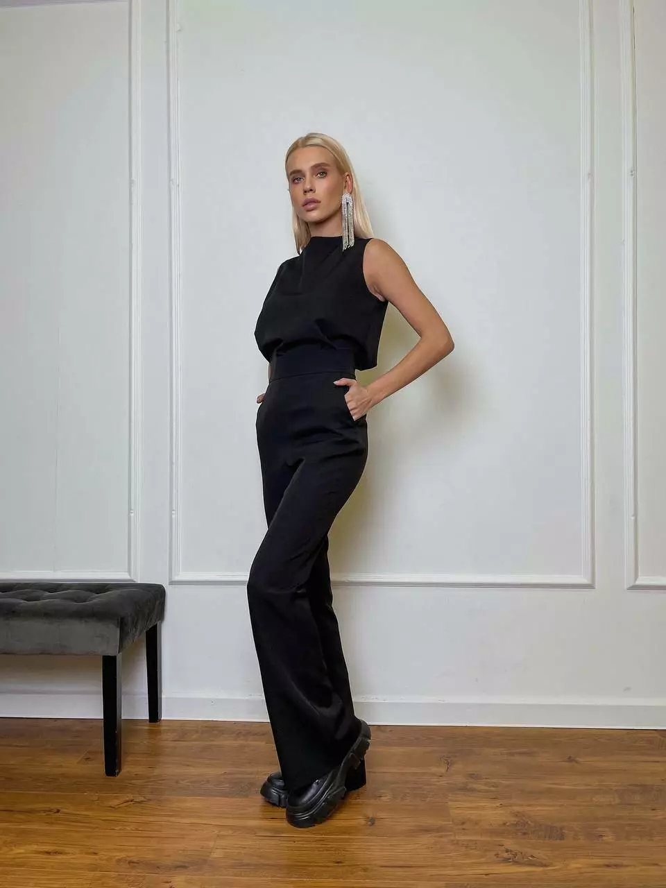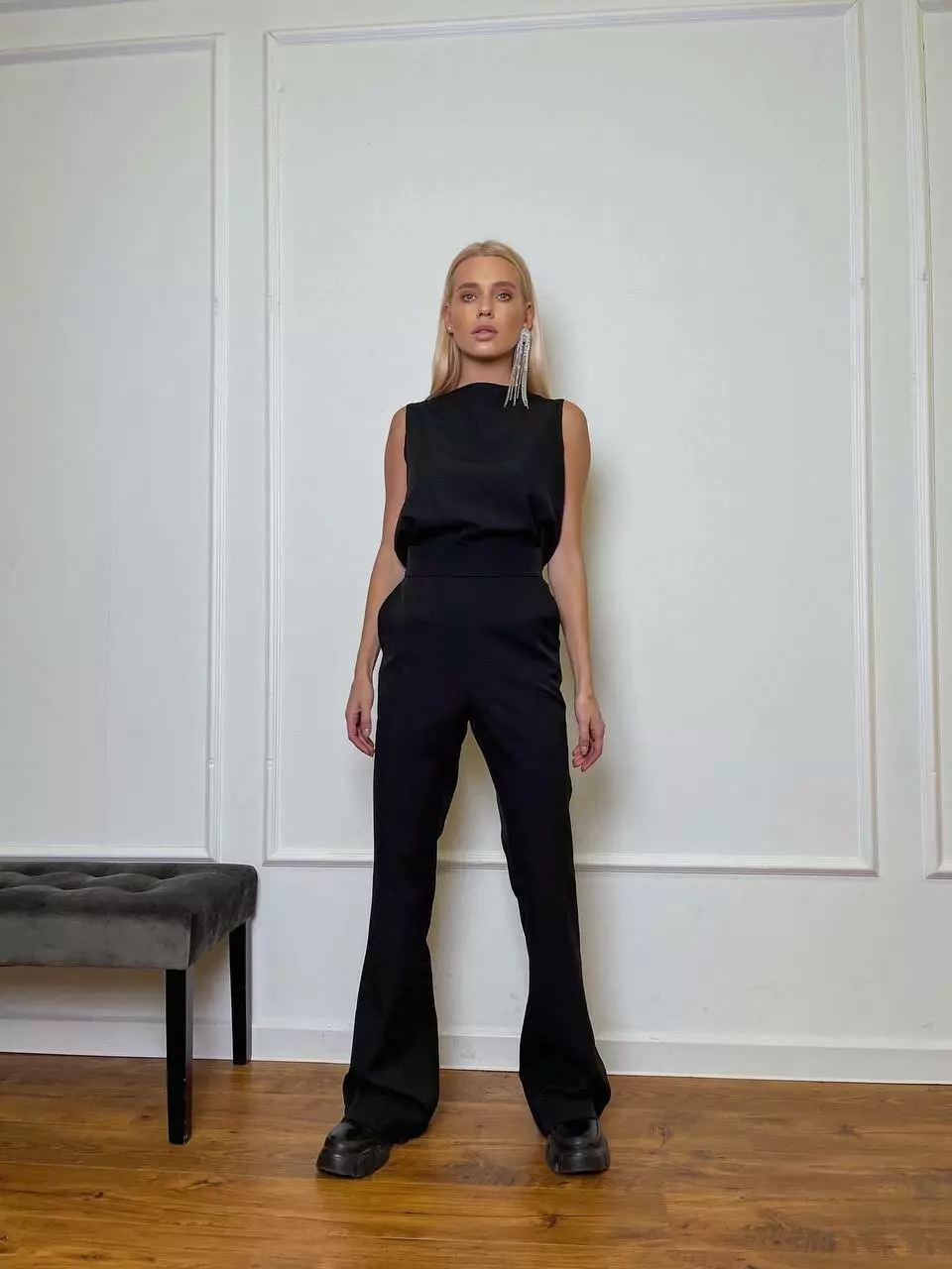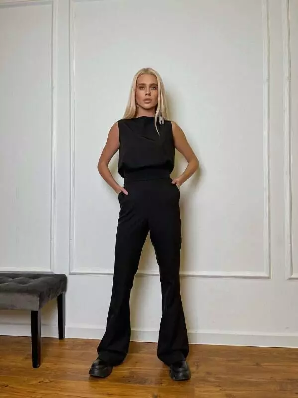 Однотонний комплект LOLA - це ідеальний варіант для стильного та модного вигляду Мінімалістичний та оригінальний костюм складається із топа, який має ідеальну посадку по грудях та вільний в талії, без кишень та застібок Штани мають високу посадку, яка ідеально підкреслить фігуру та клеш від коліна, бічні робочі кишені, застібаються штани на потайну блискавку позаду.