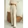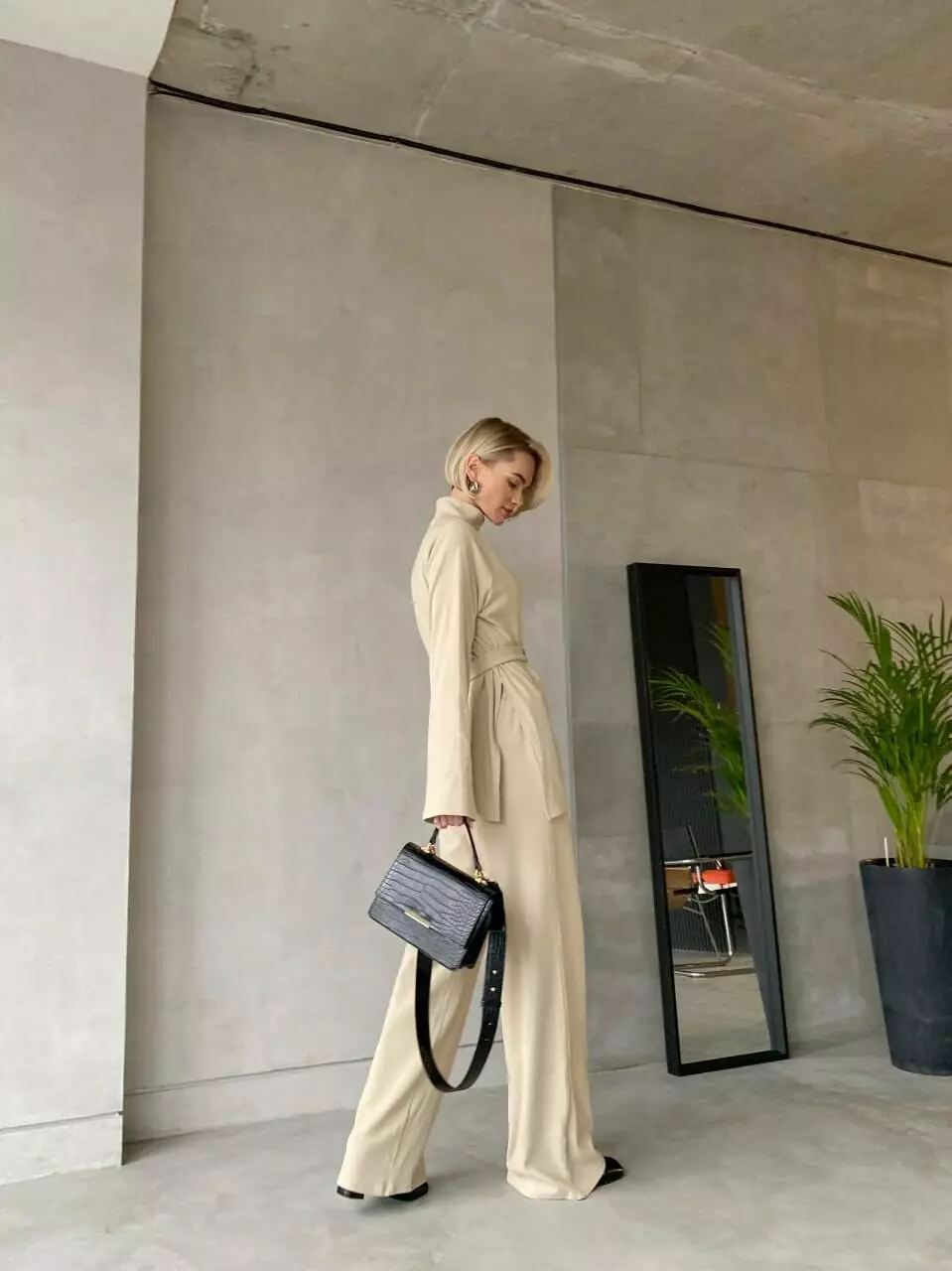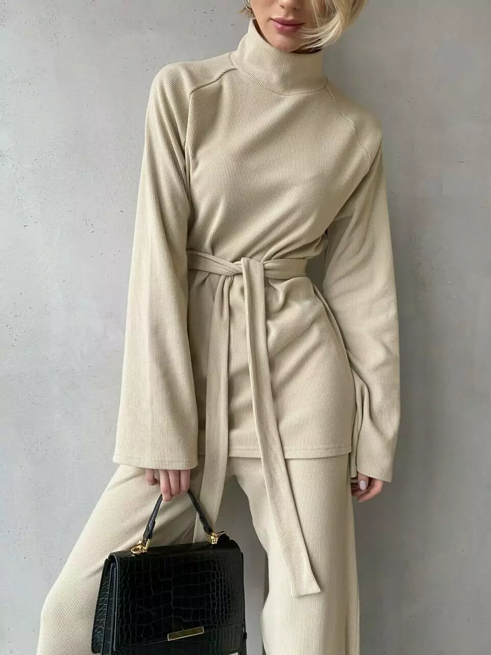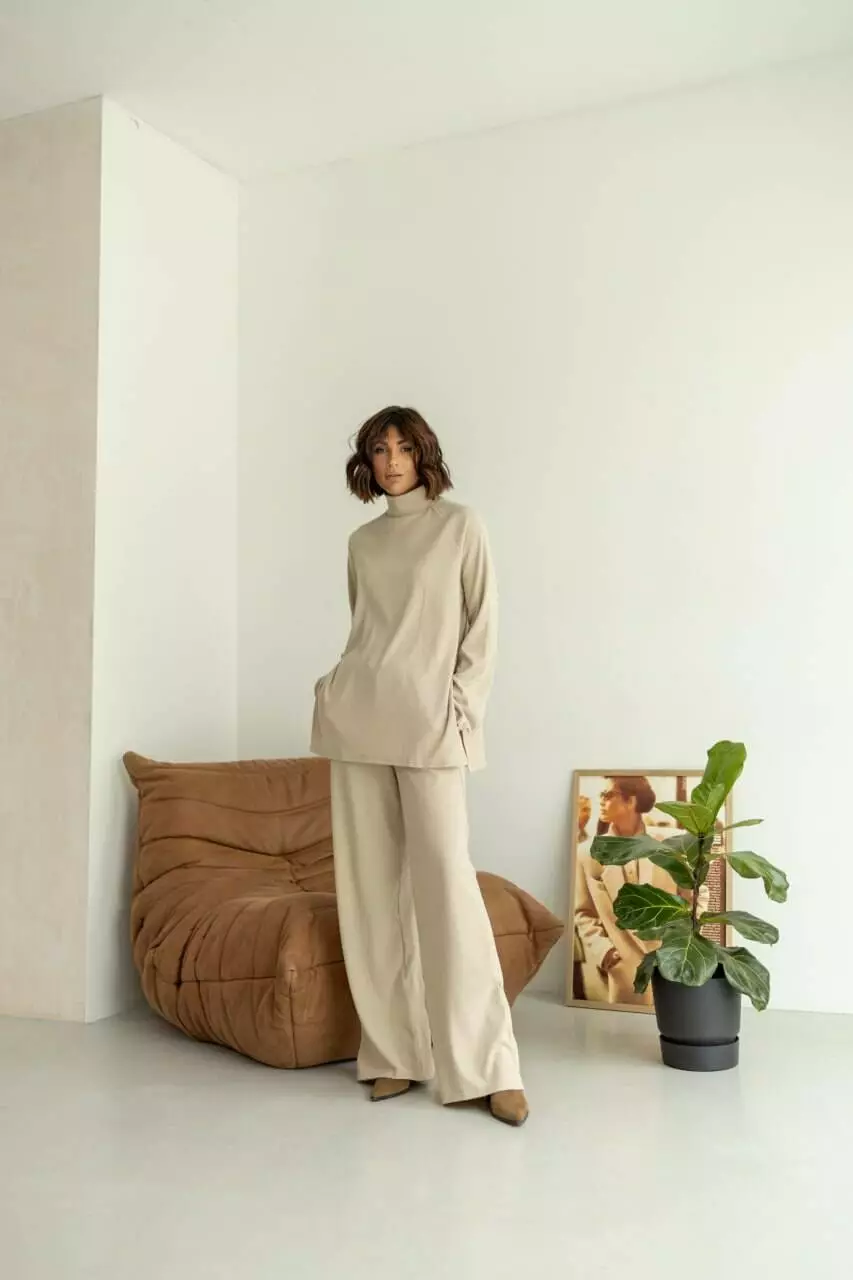 Виріб має пояс в тон, штани високої посадки та прямого крою на еластичній гумці, кофта з горлом, широка, з двома розрізами з боків