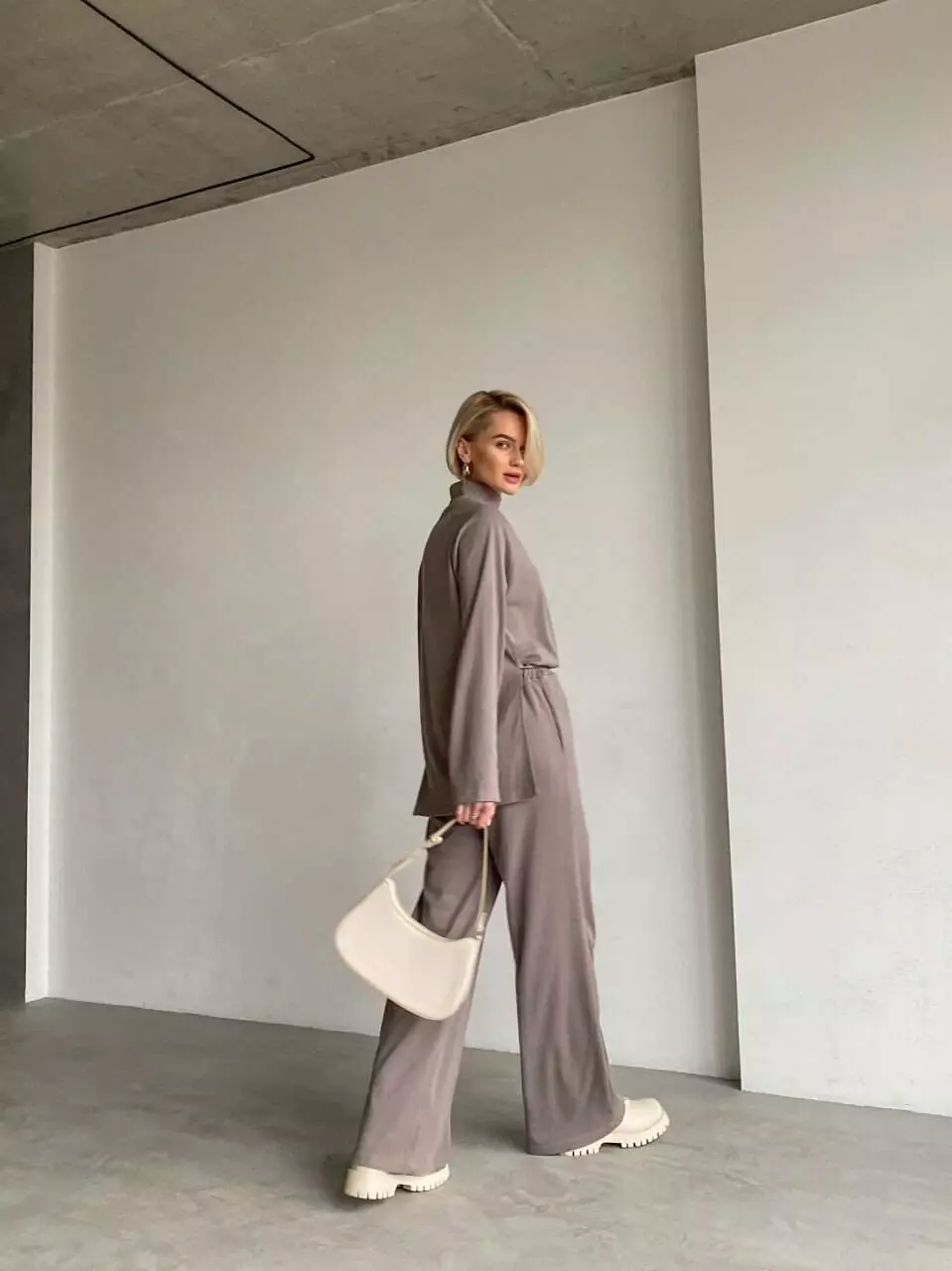 Виріб має пояс в тон, штани високої посадки та прямого крою на еластичній гумці, кофта з горлом, широка, з двома розрізами з боків