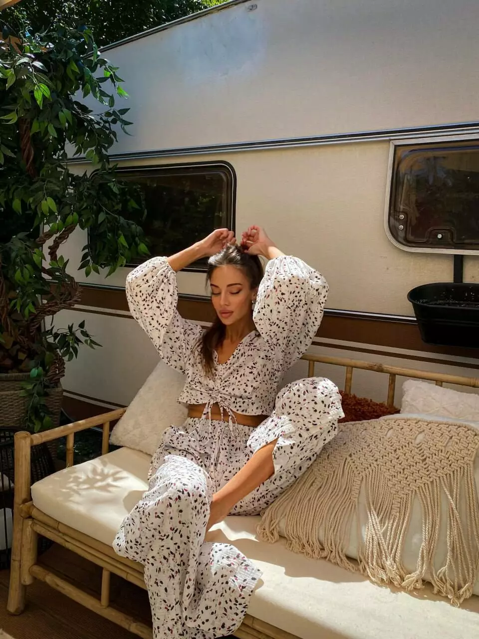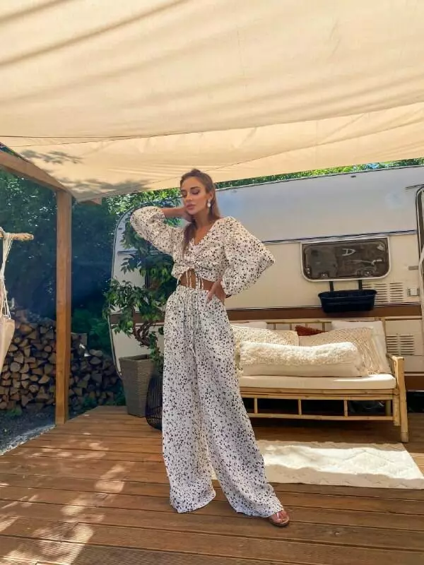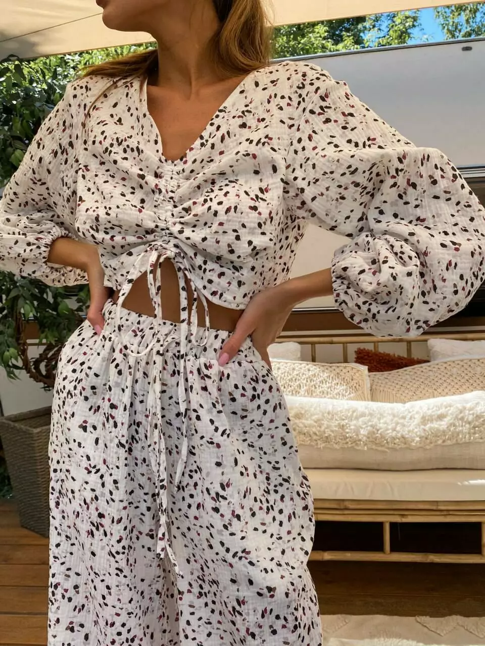 Широкі рукави, топ по переду на зав'язці Штани прямі, широкі
