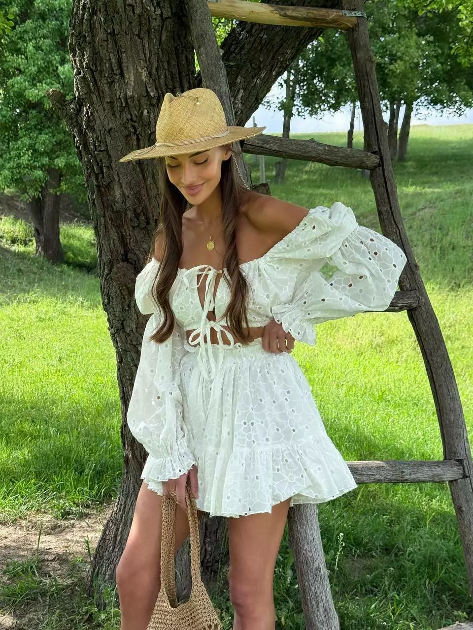 Трендовий костюм з міні та ліфом Міні-Спідниця зі зборкою по низу Ліф -топ, на завʼязках які регулюються, та обʼємними рукавами. Тканина : 100% бавовна ( прошва) Колір: чорний Розмір : xs/m