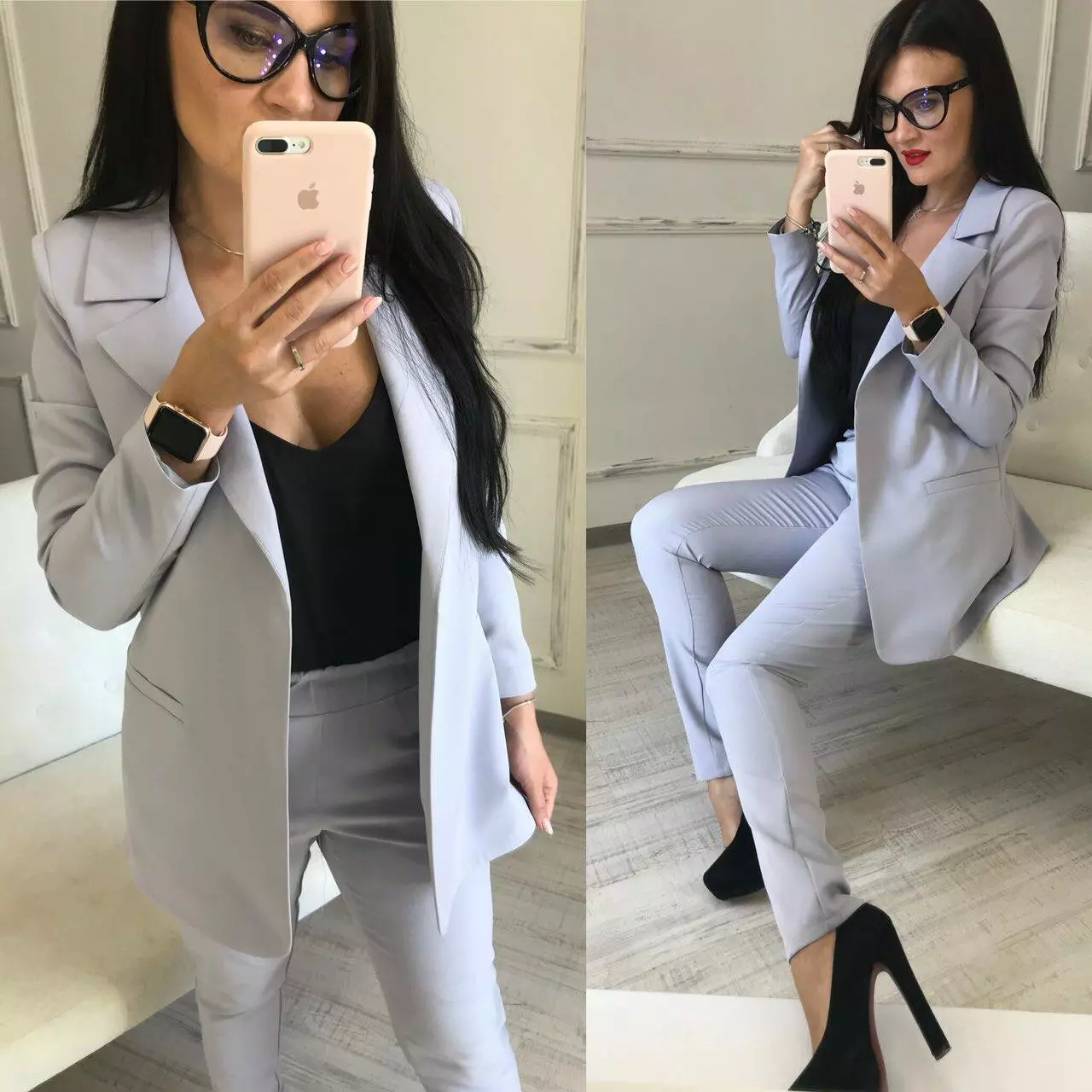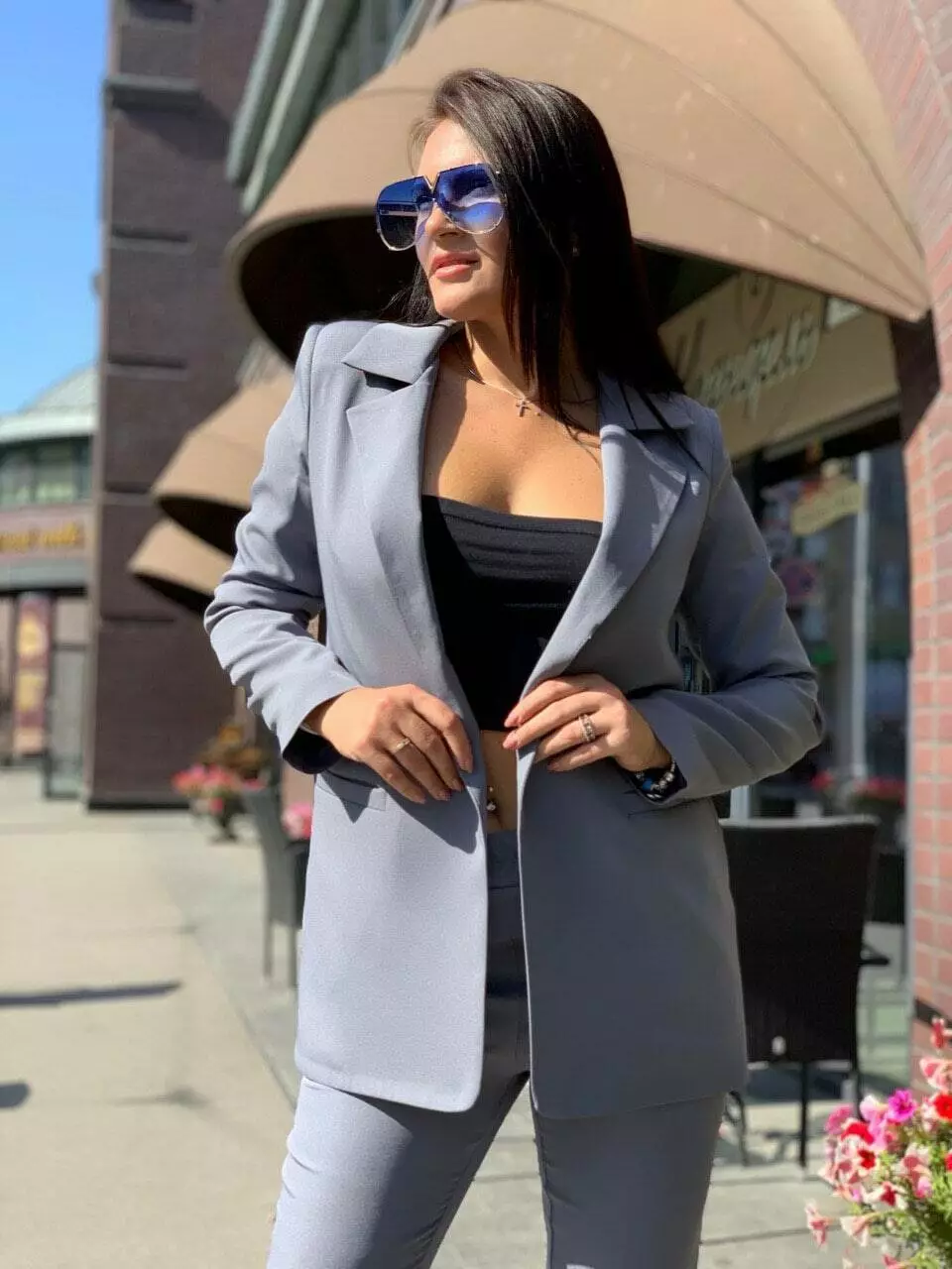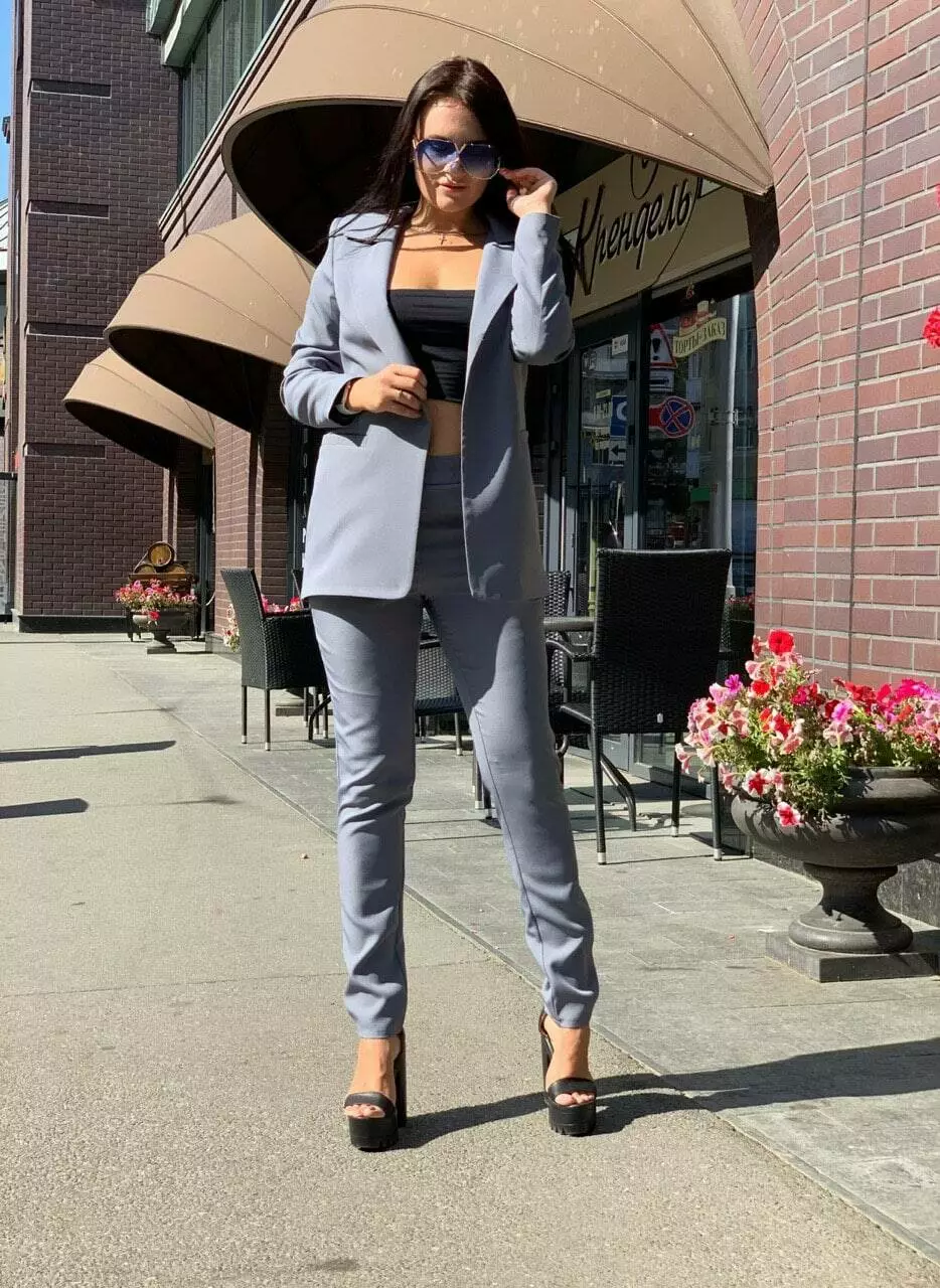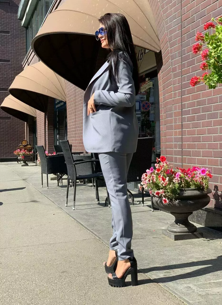 Стильний класичний костюм із тендовими штанами-дудочками високої посадки та дуже ефектним піджаком прямого крою з кишенями