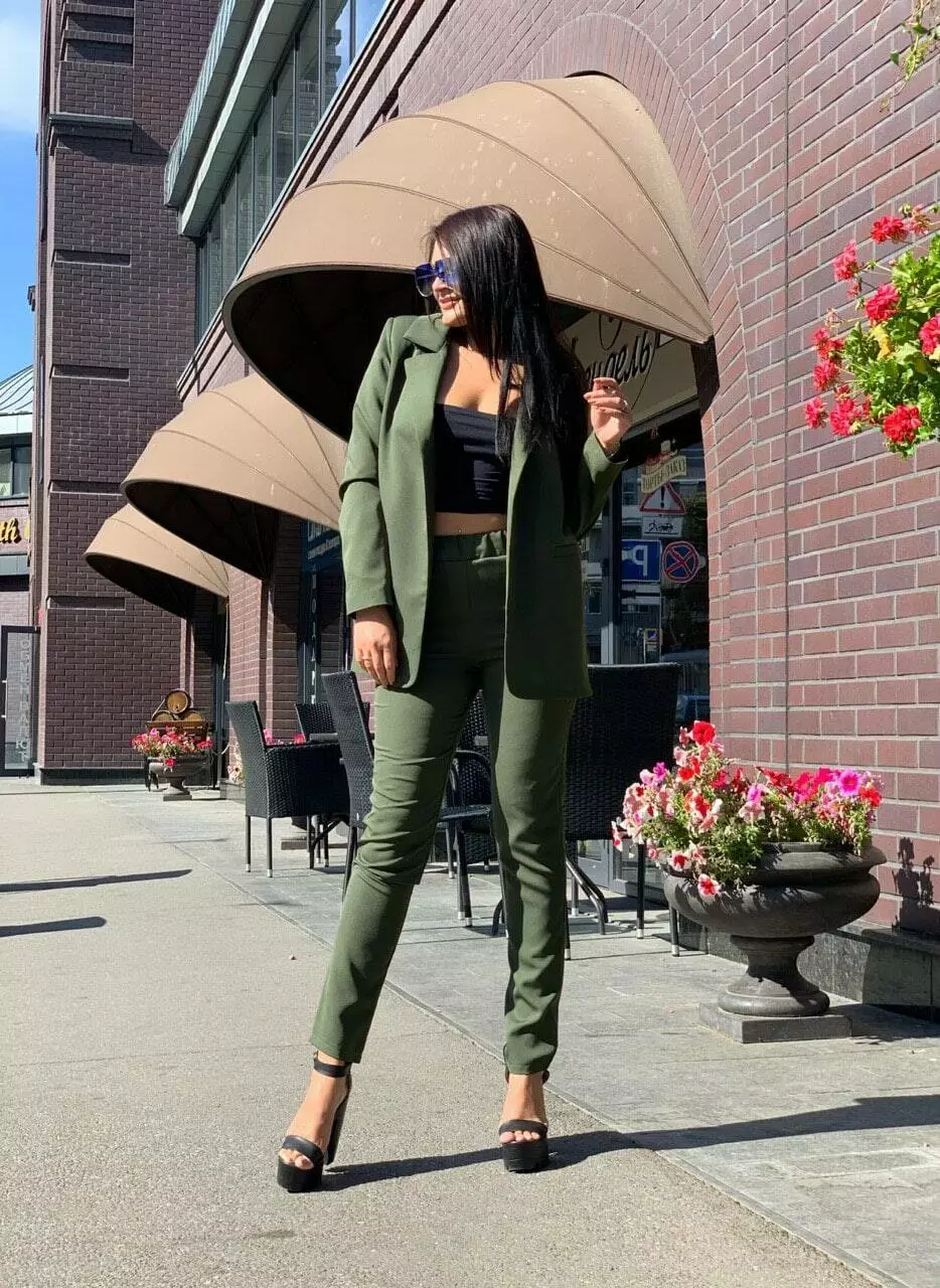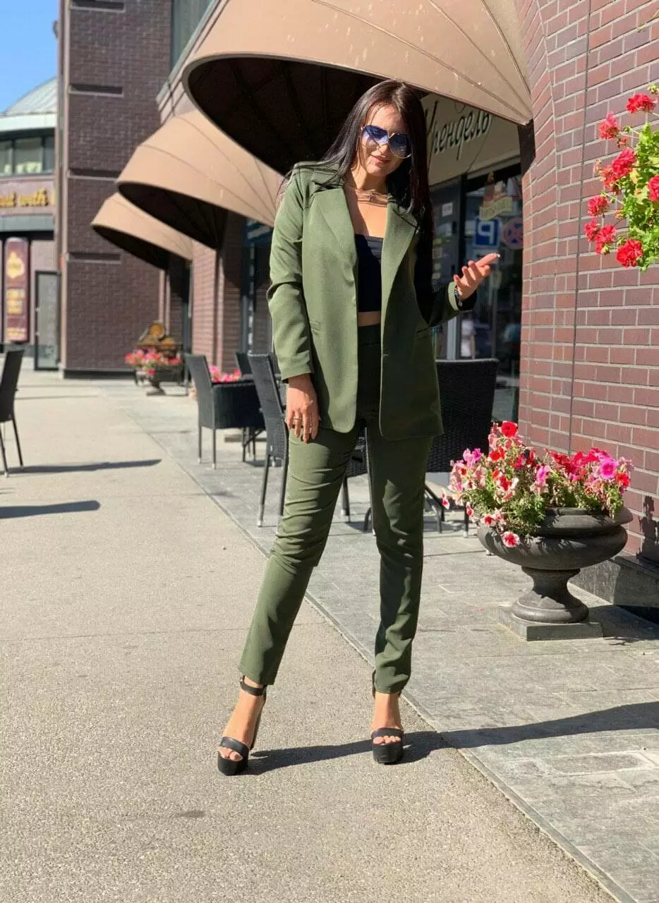 Стильний класичний костюм із тендовими штанами-дудочками високої посадки та дуже ефектним піджаком прямого крою з кишенями