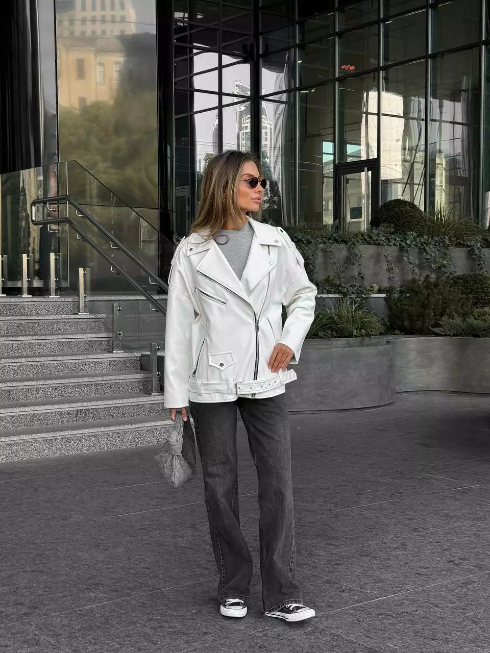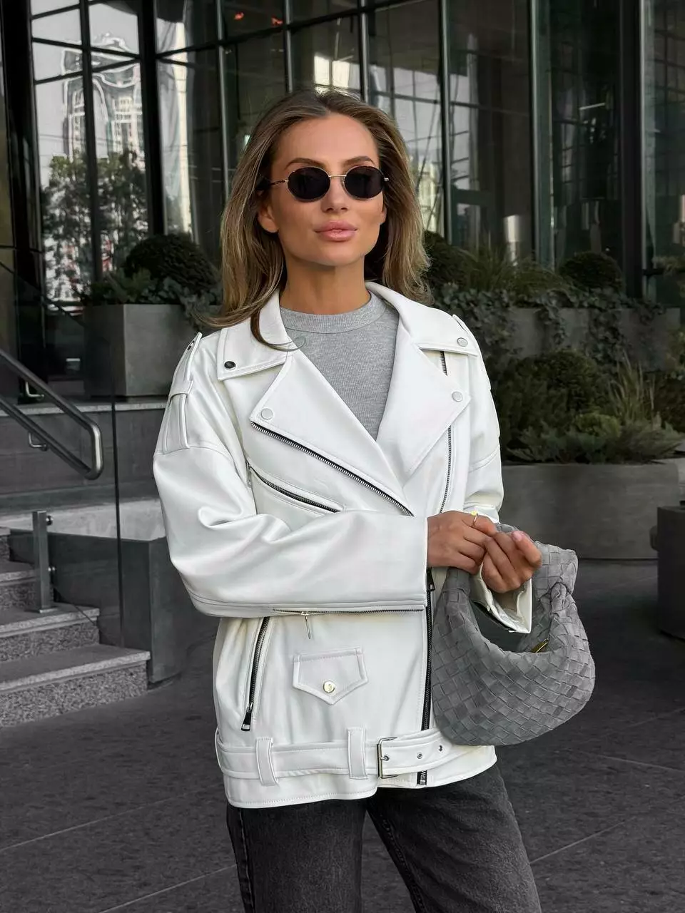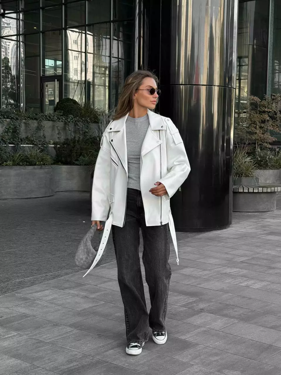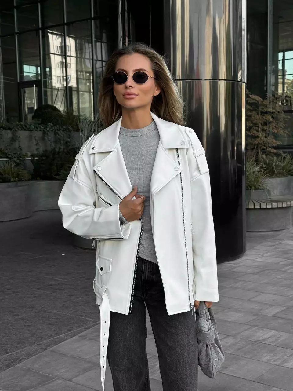 Оверсайз подовжена куртка, виконана з люксової екошкіри та дуже якісного пошиття Металева фурнітура, всі робочі кишені, пояс в колір виробу йде у комплекті