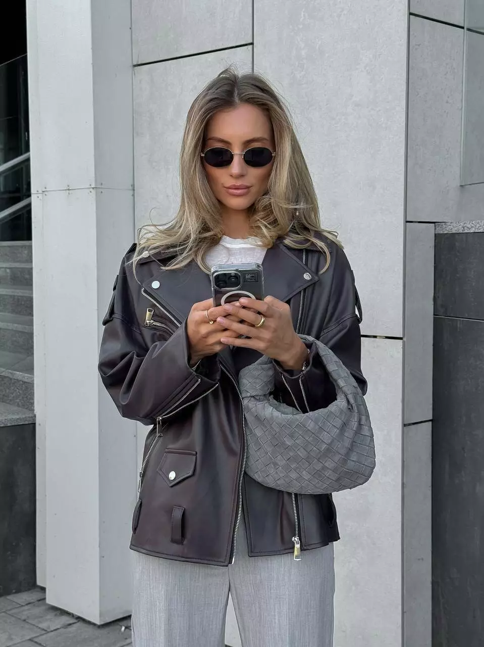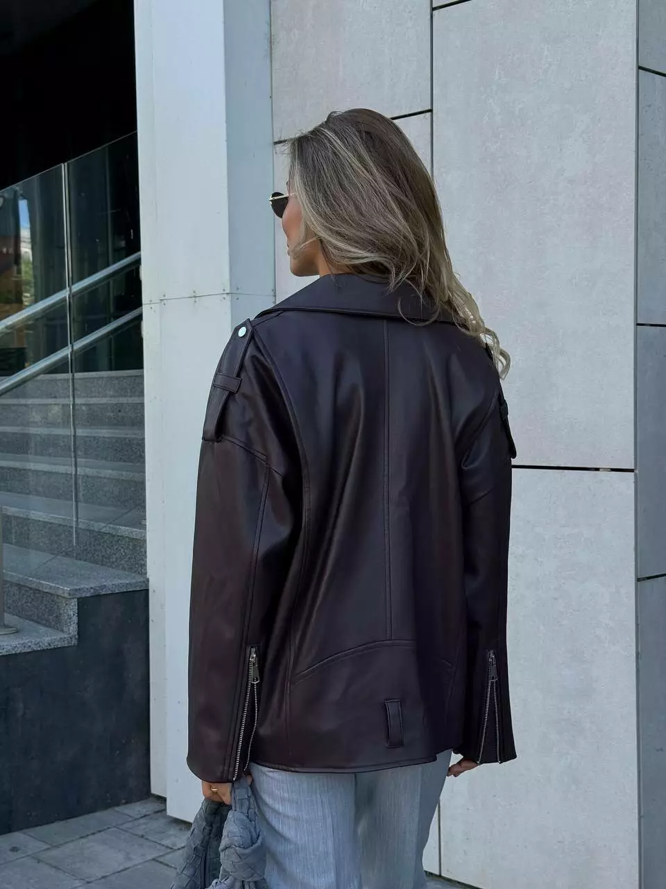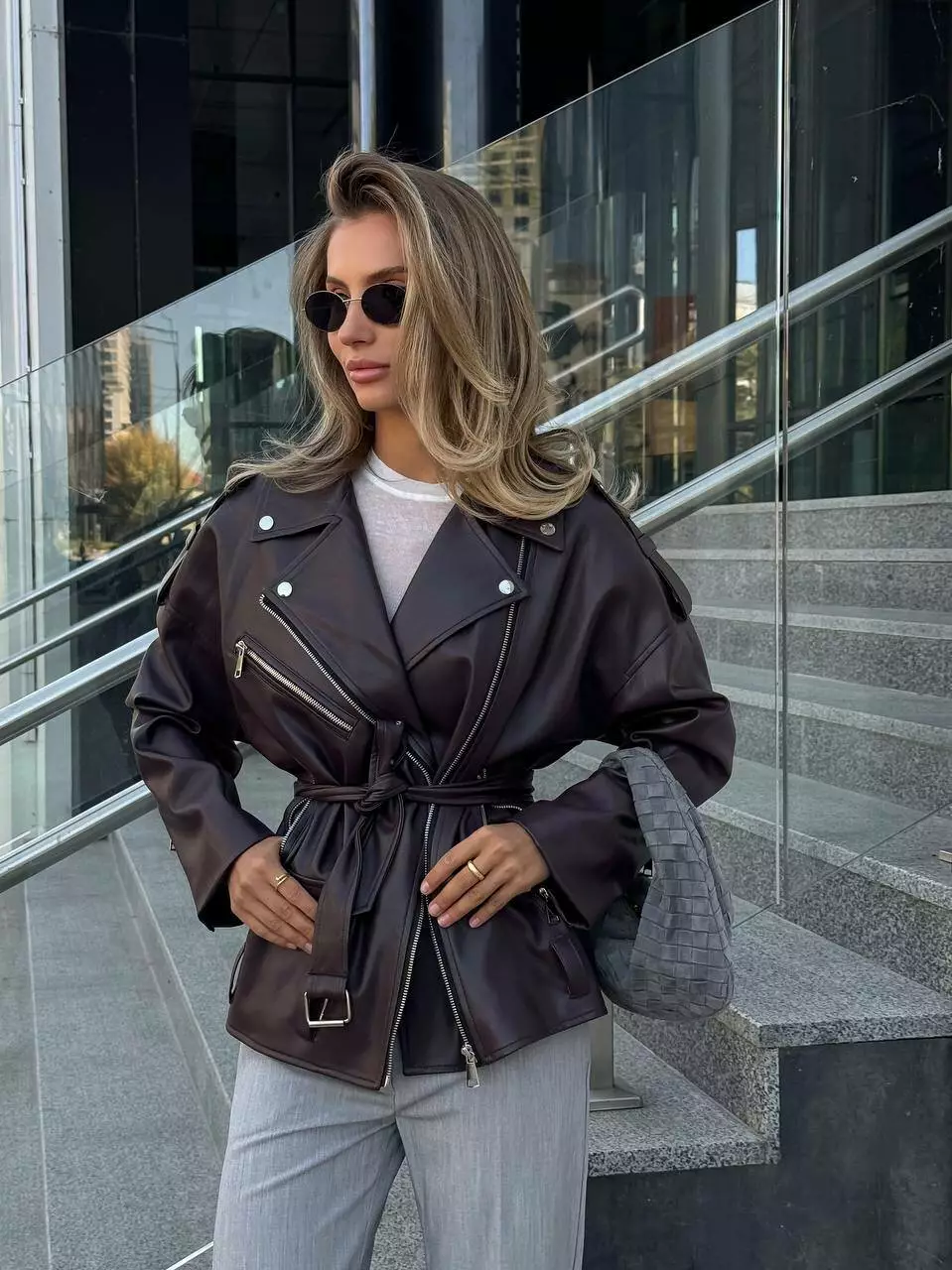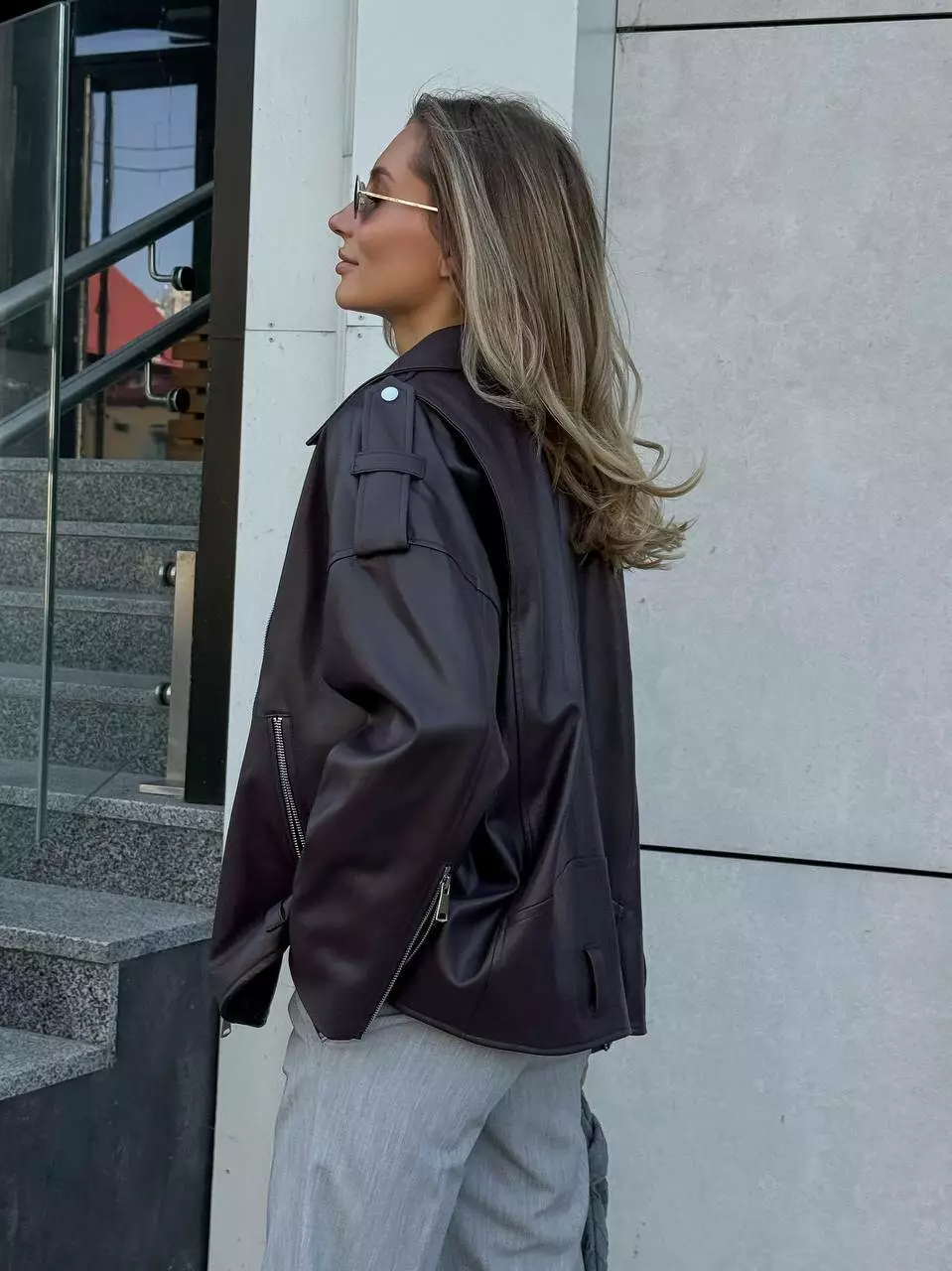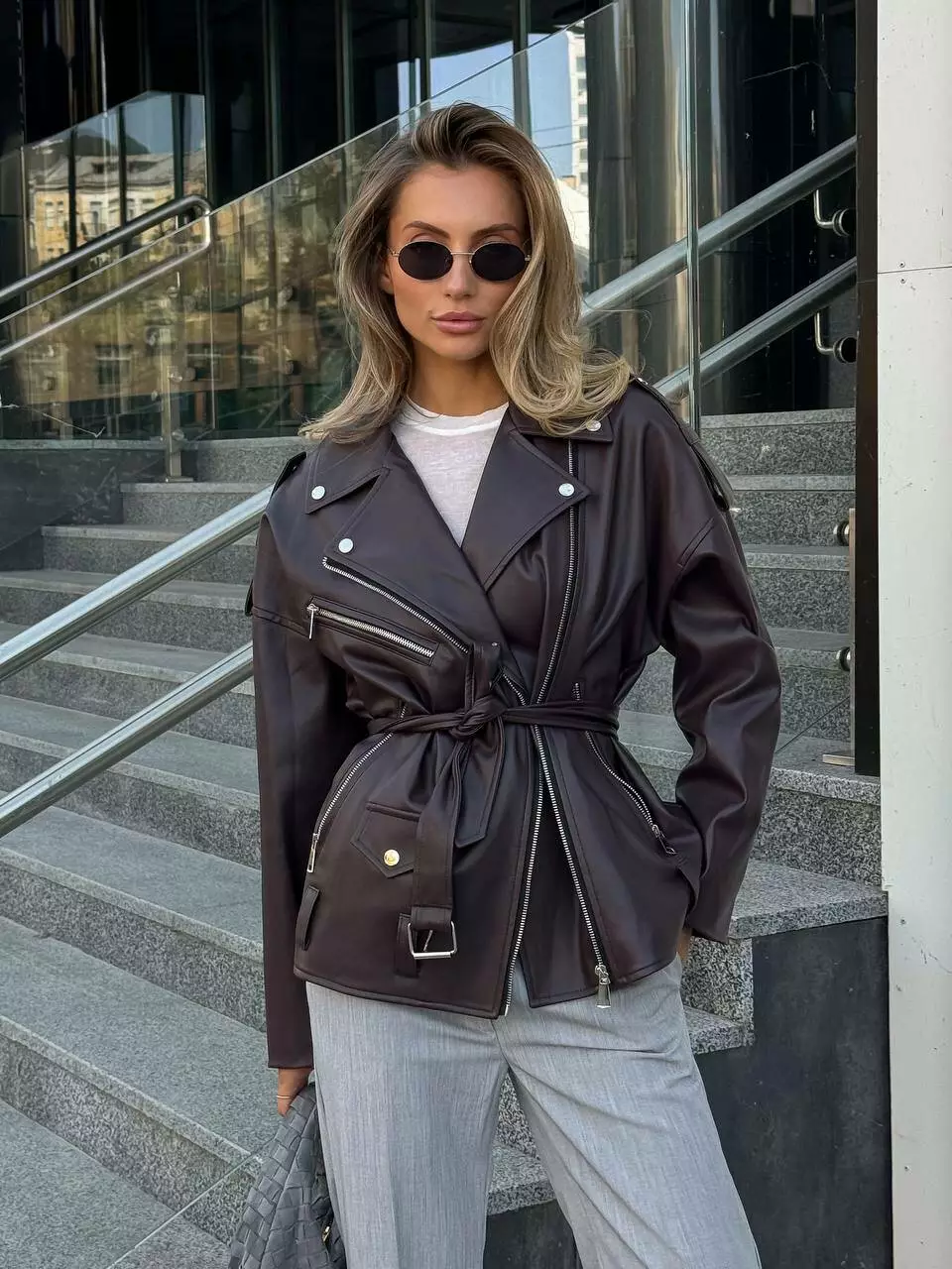 Оверсайз подовжена куртка, виконана з люксової екошкіри та дуже якісного пошиття Металева фурнітура, всі робочі кишені, пояс в колір виробу йде у комплекті