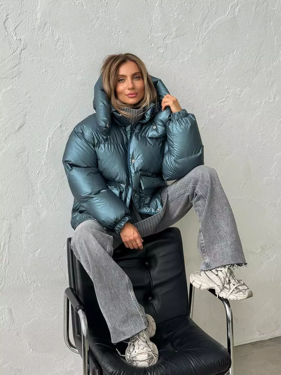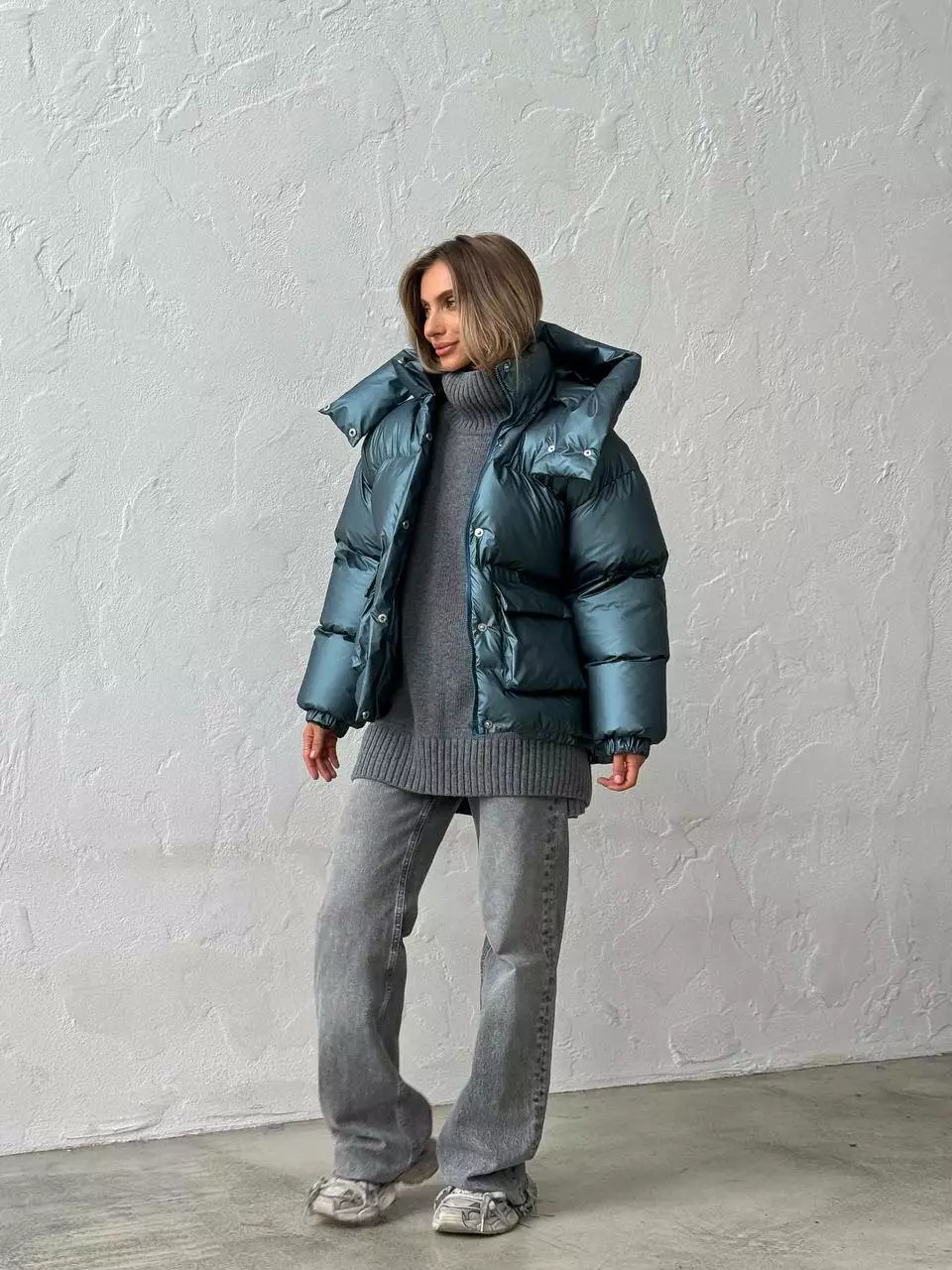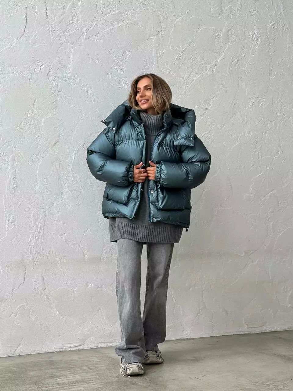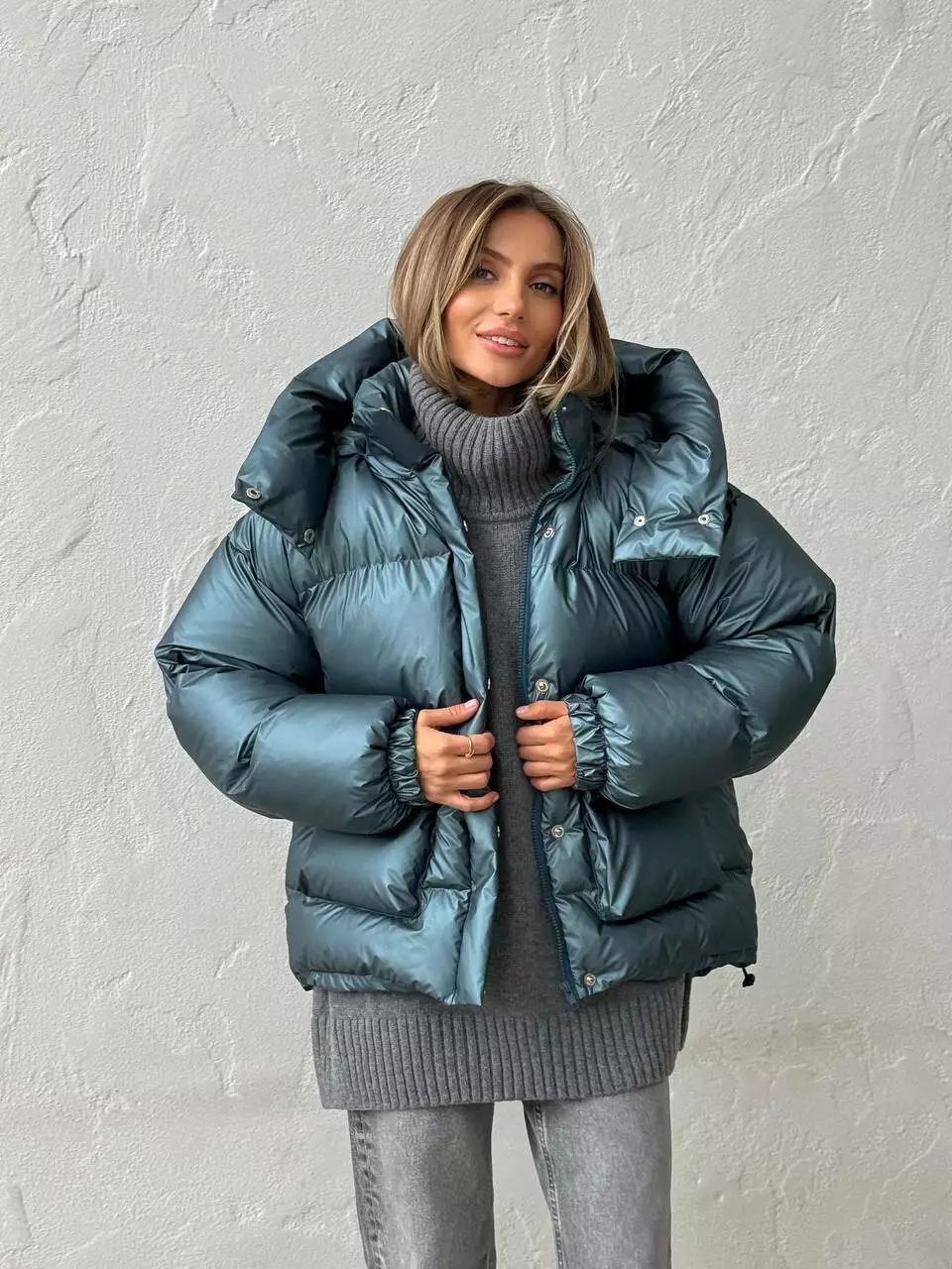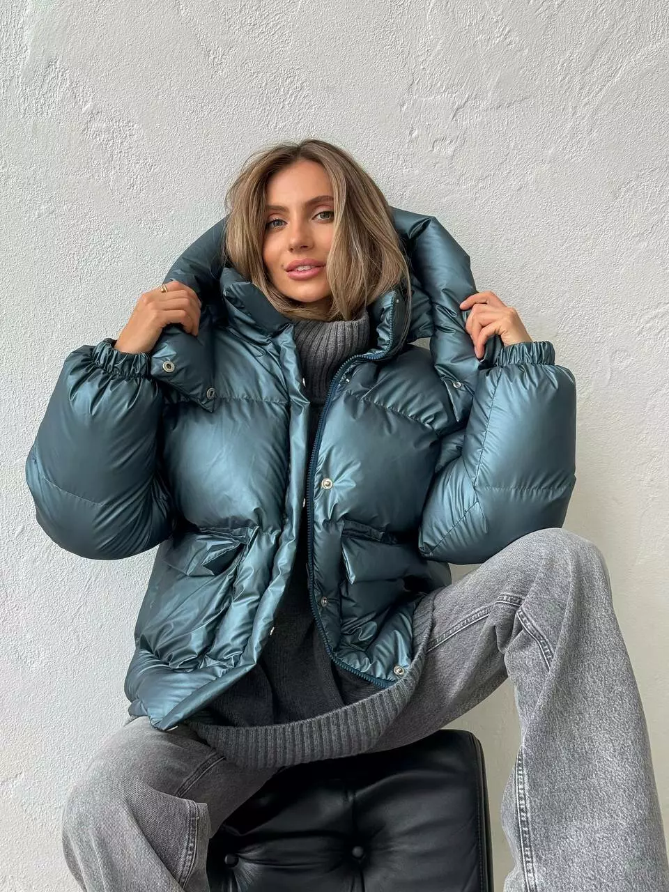 Зимовий укорочений пуховик, виконаний з плащівки на мембрані, що є непродувною і водонепроникаючою. Капюшон знімається