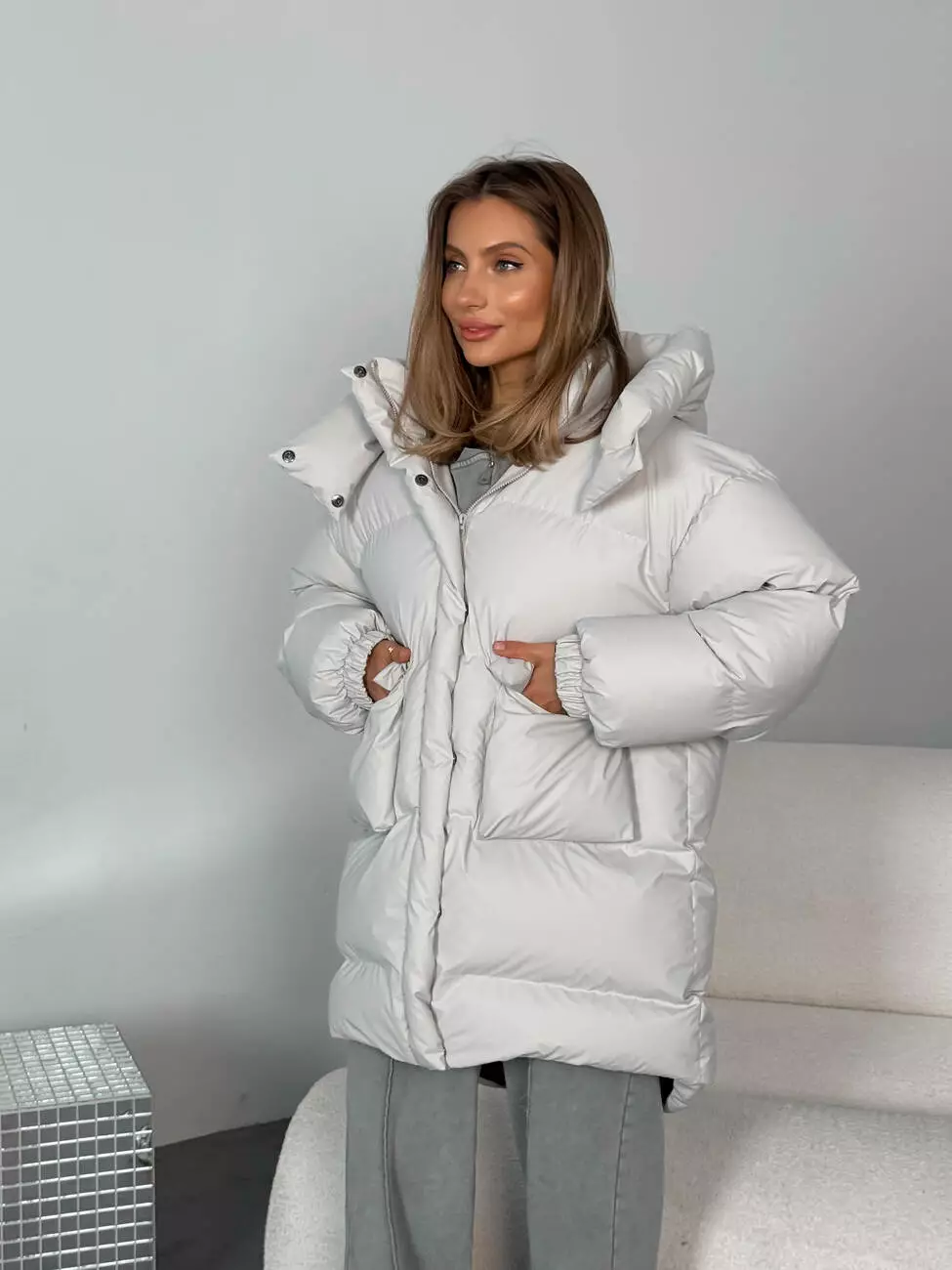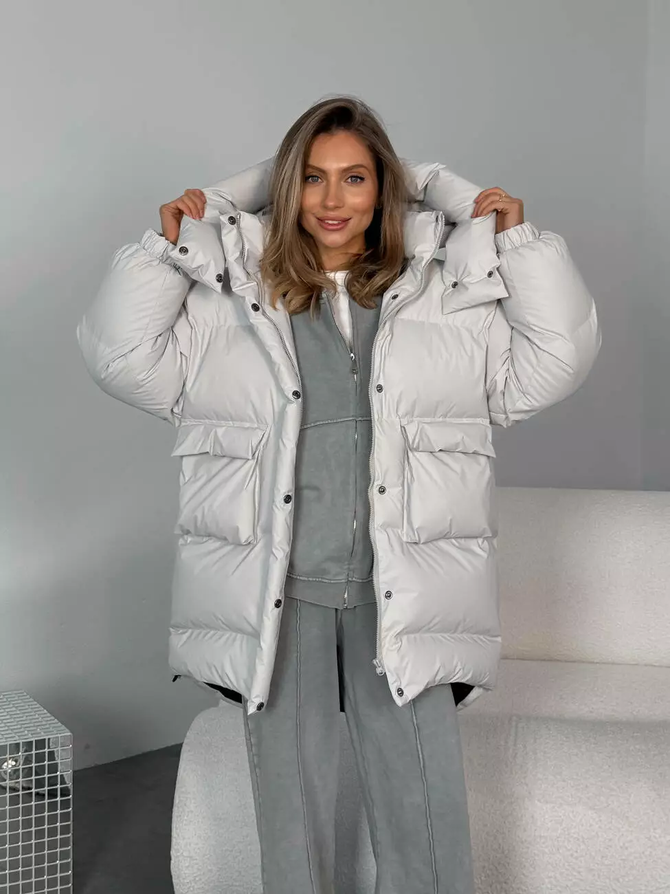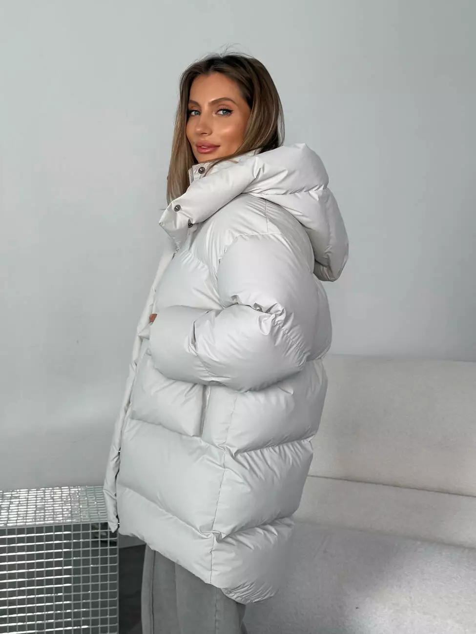 Зимовий подовжений пуховик, виконаний з плащівки на мембрані, що є непродувною і водонепроникаючою. Капюшон знімається