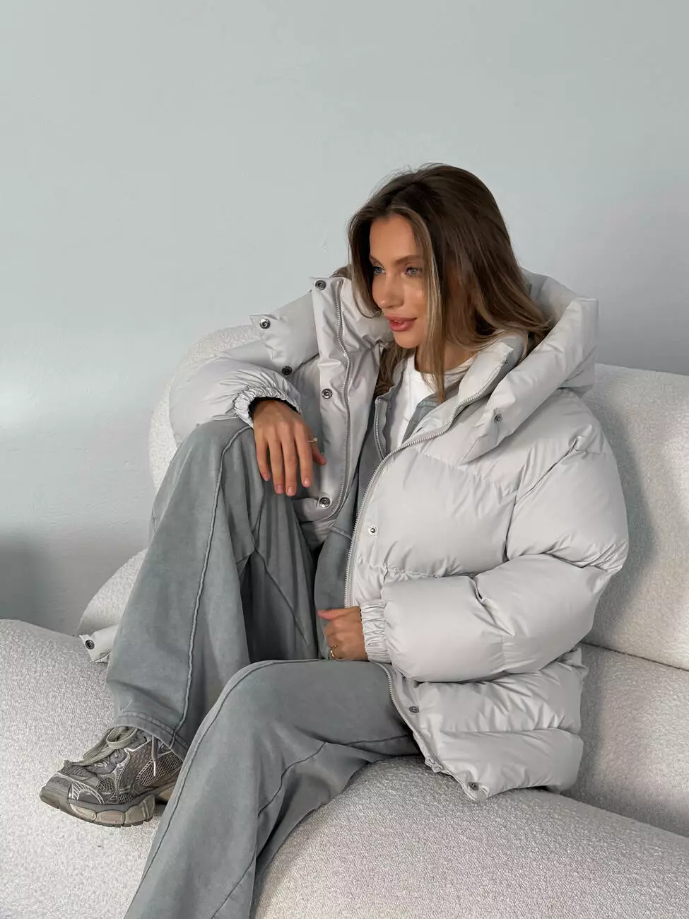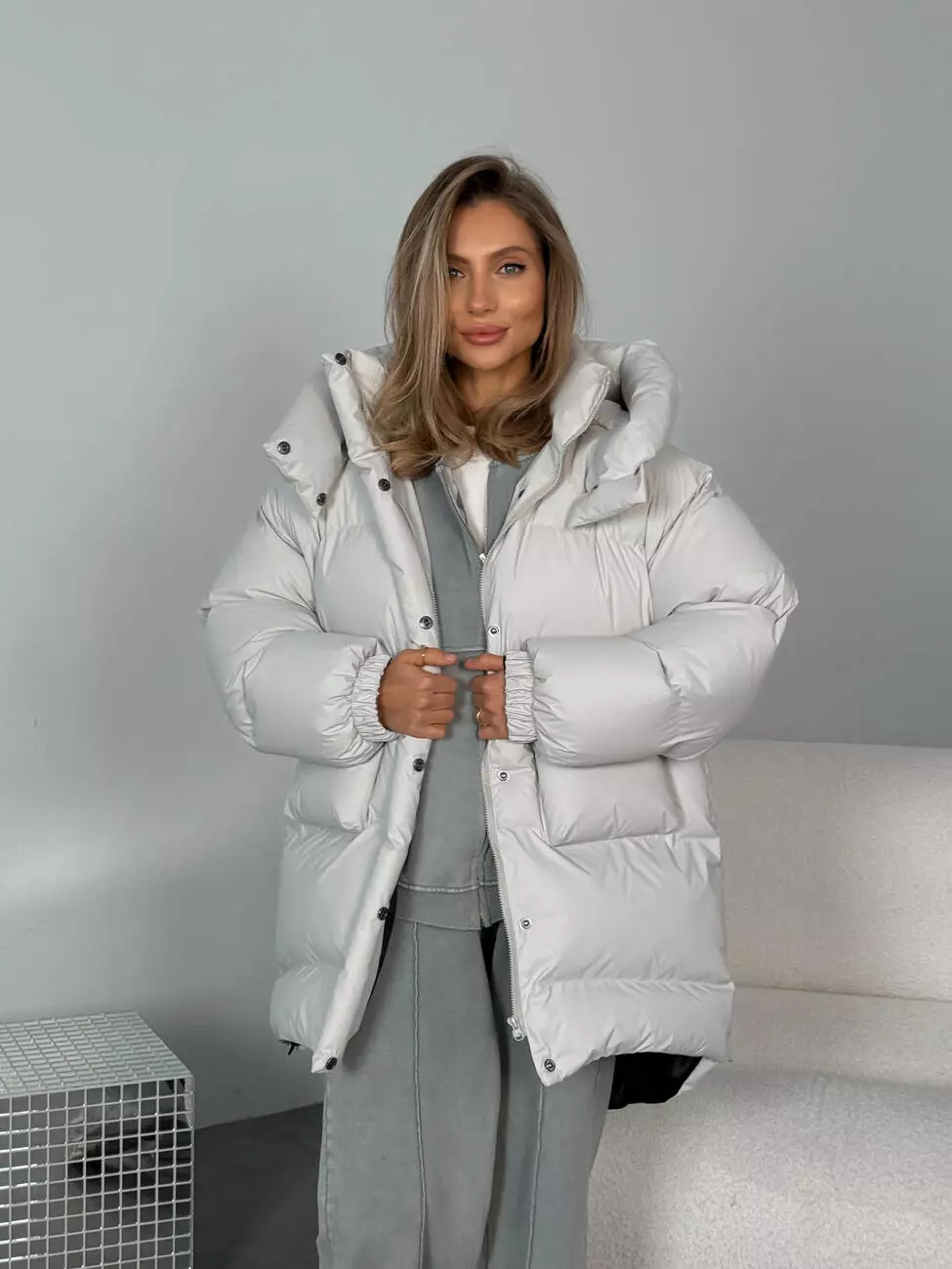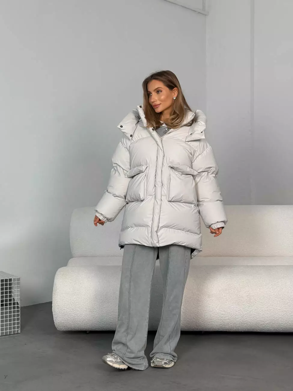 Зимовий подовжений пуховик, виконаний з плащівки на мембрані, що є непродувною і водонепроникаючою. Капюшон знімається