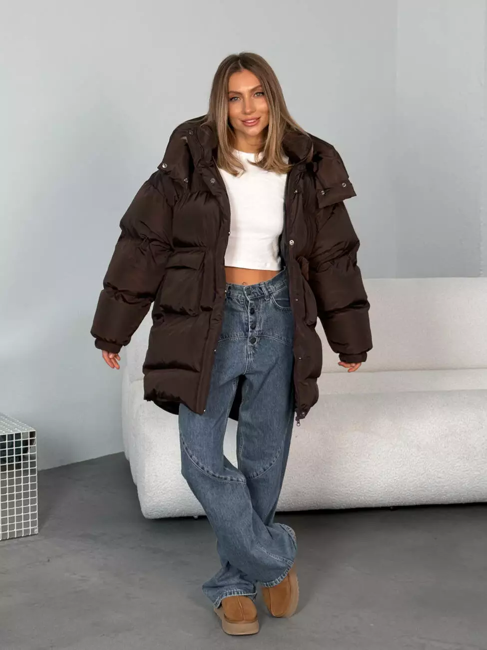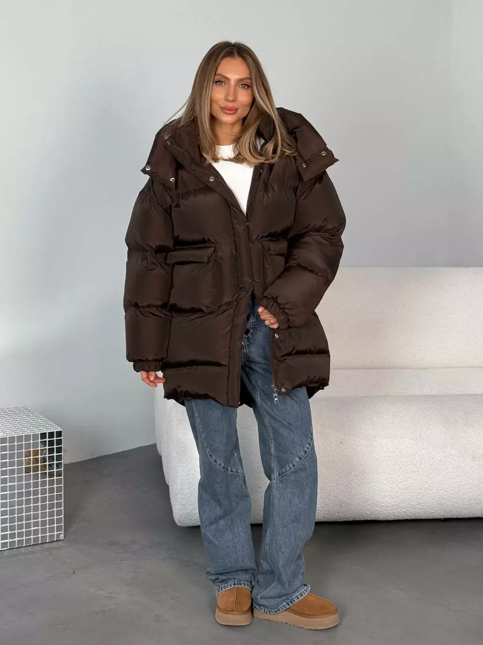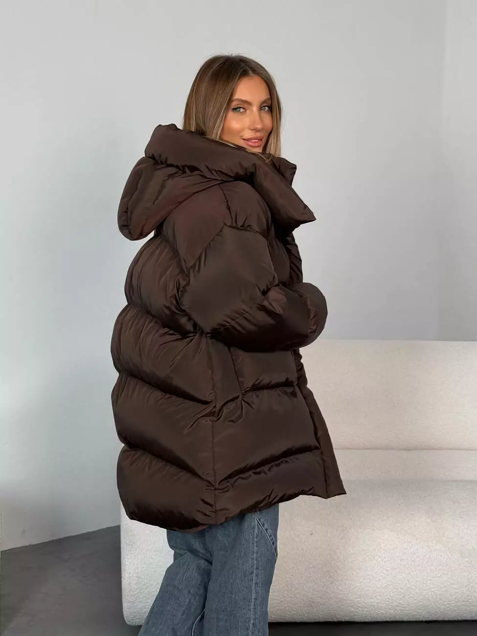 Зимовий подовжений пуховик, виконаний з плащівки на мембрані, що є непродувною і водонепроникаючою. Капюшон знімається