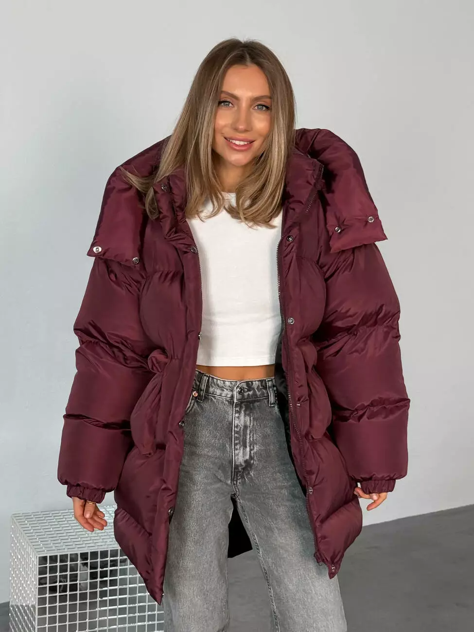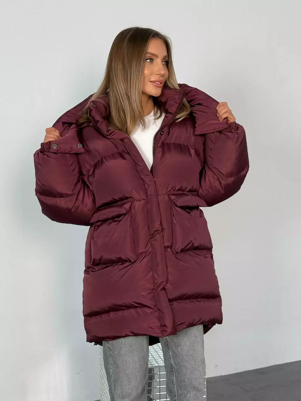 Зимовий подовжений пуховик, виконаний з плащівки на мембрані, що є непродувною і водонепроникаючою. Капюшон знімається