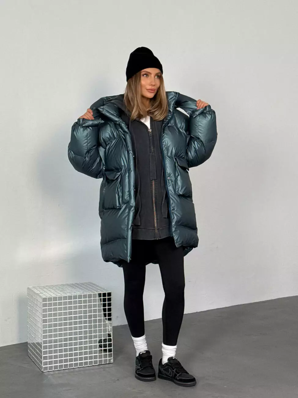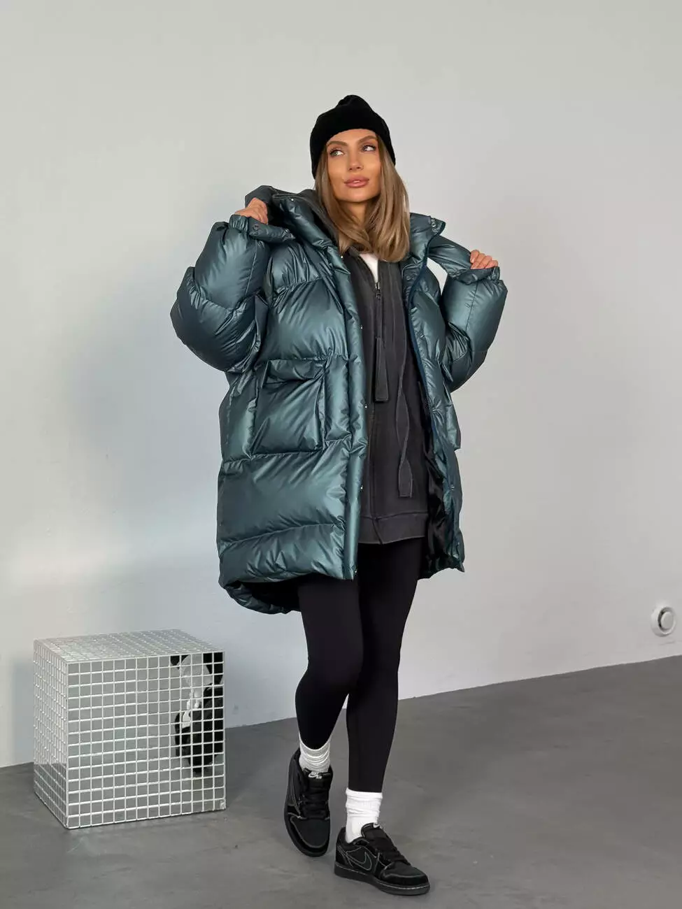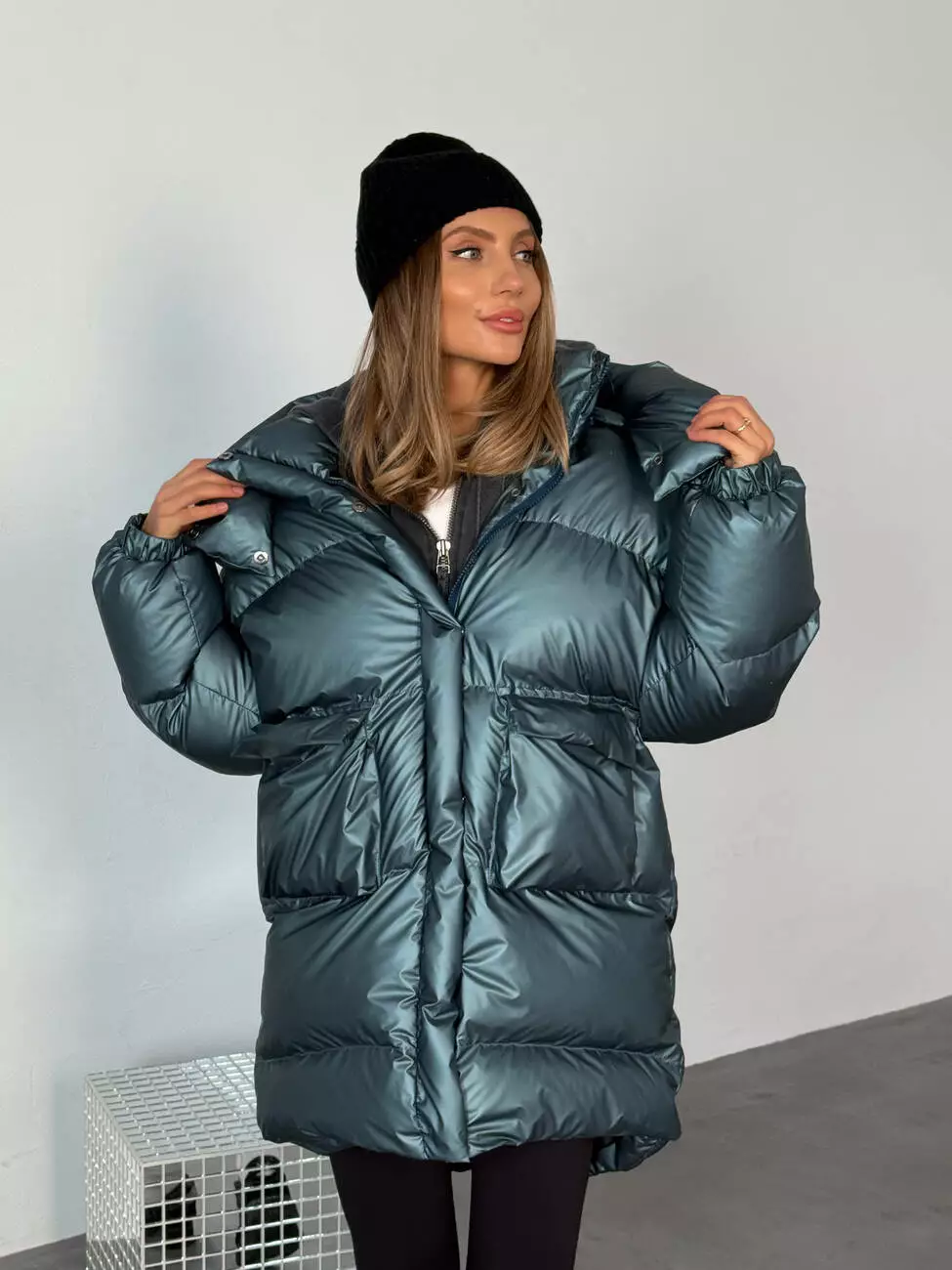 Зимовий подовжений пуховик, виконаний з плащівки на мембрані, що є непродувною і водонепроникаючою. Капюшон знімається