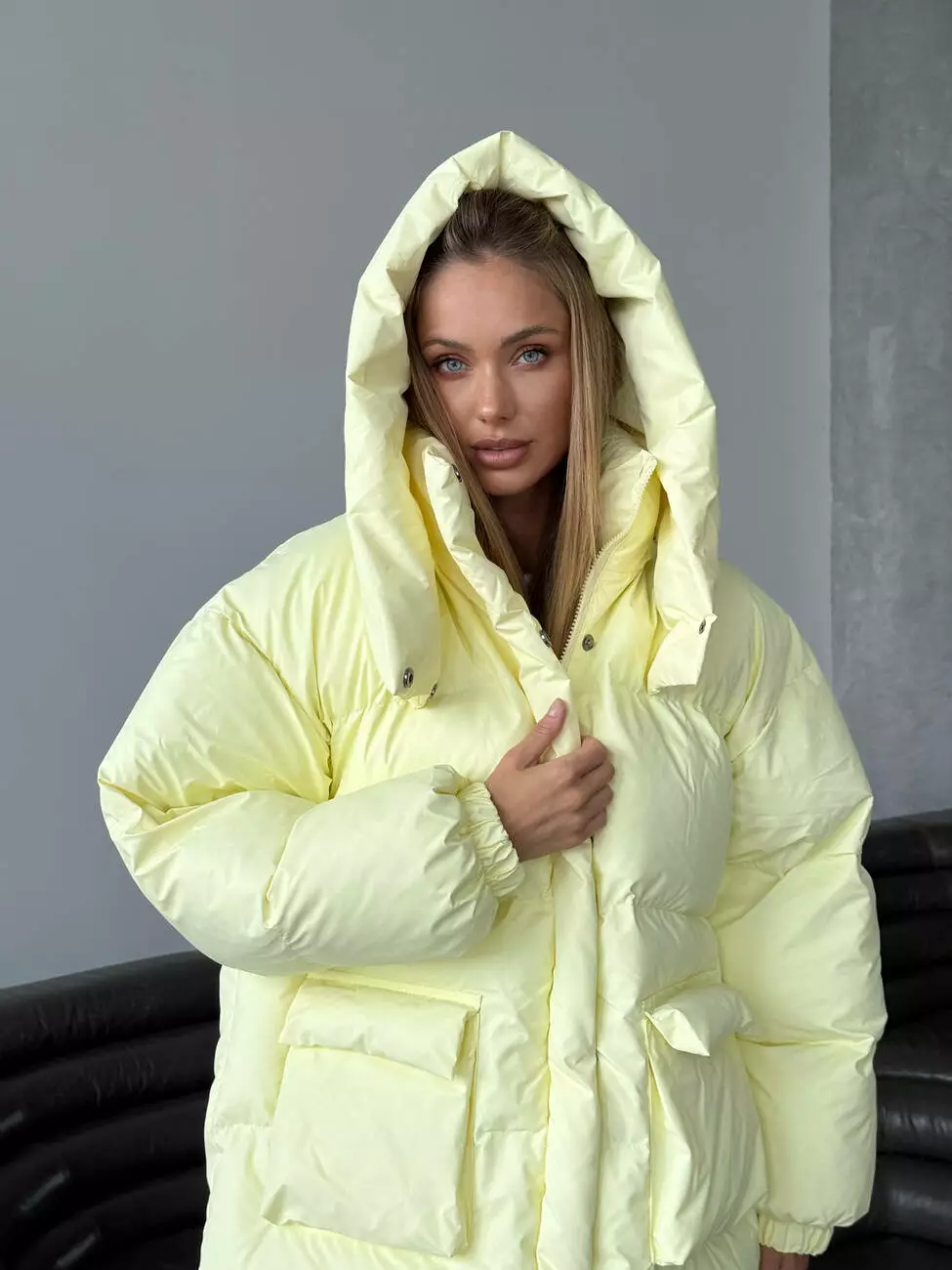 Зимовий подовжений пуховик, виконаний з плащівки на мембрані, що є непродувною і водонепроникаючою. Капюшон знімається