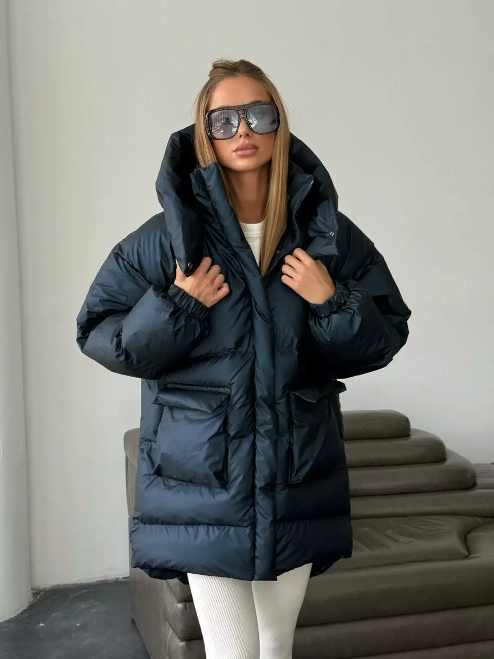 Зимовий подовжений пуховик, виконаний з плащівки на мембрані, що є непродувною і водонепроникаючою. Капюшон знімається