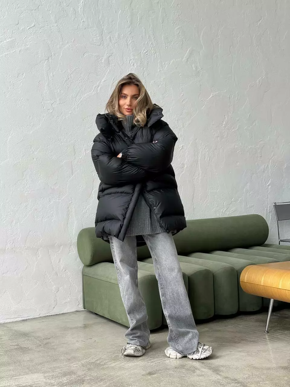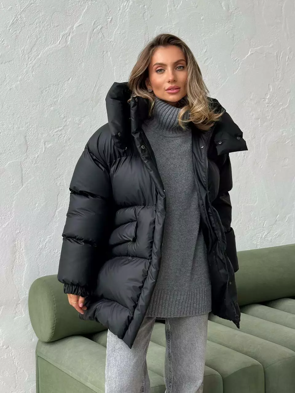 Зимовий подовжений пуховик, виконаний з плащівки на мембрані, що є непродувною і водонепроникаючою. Капюшон знімається