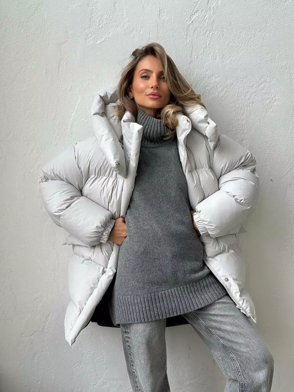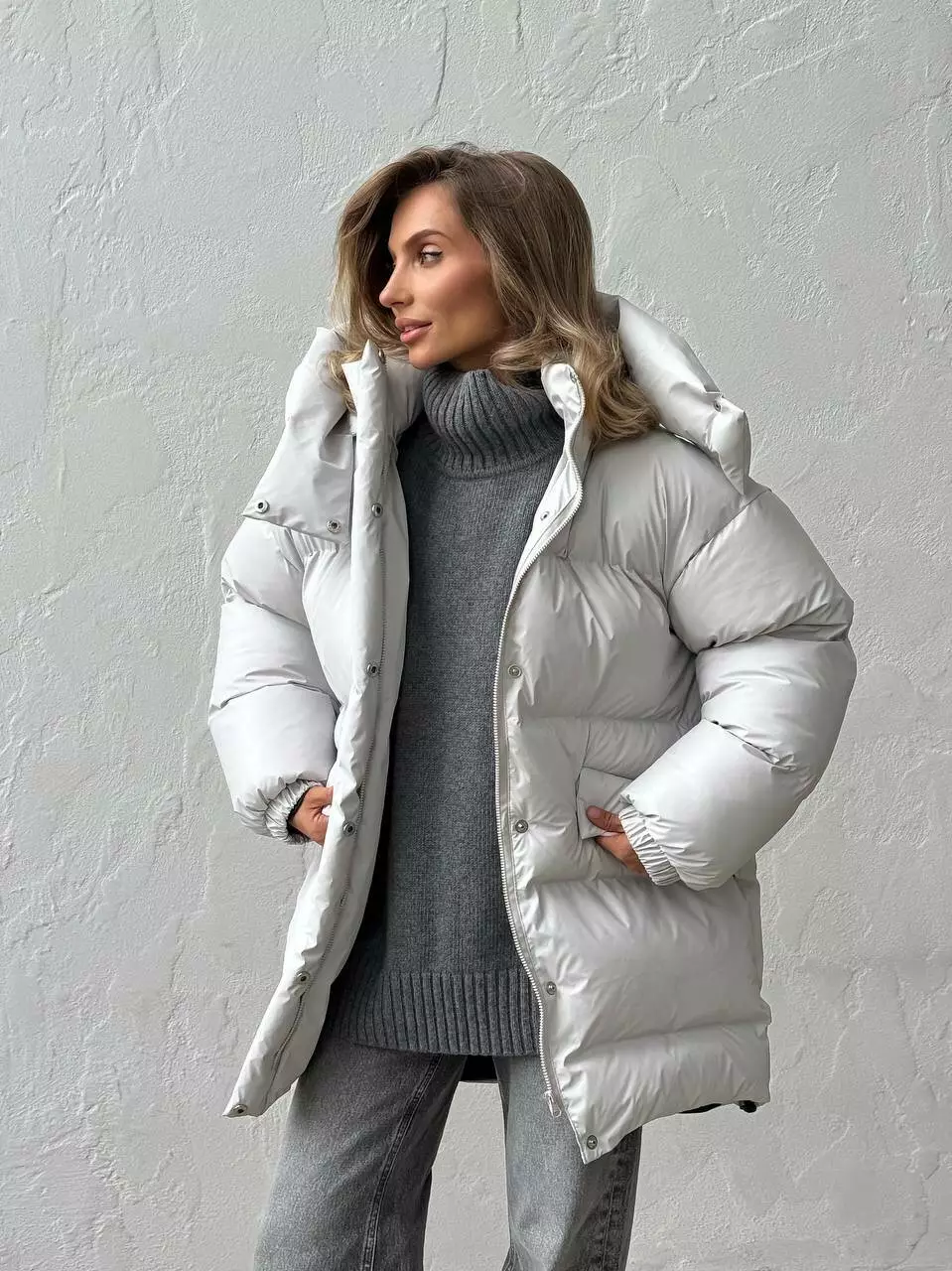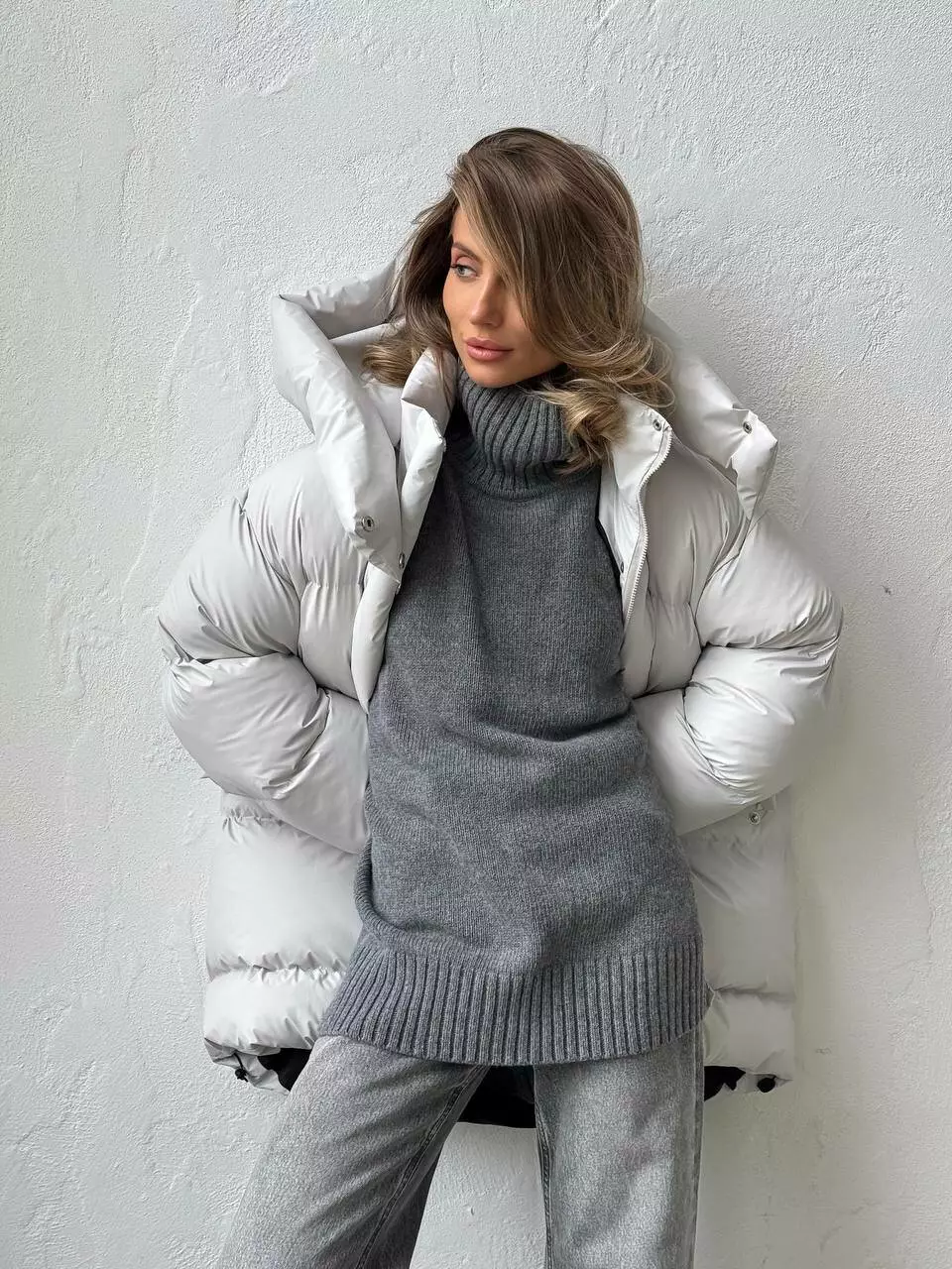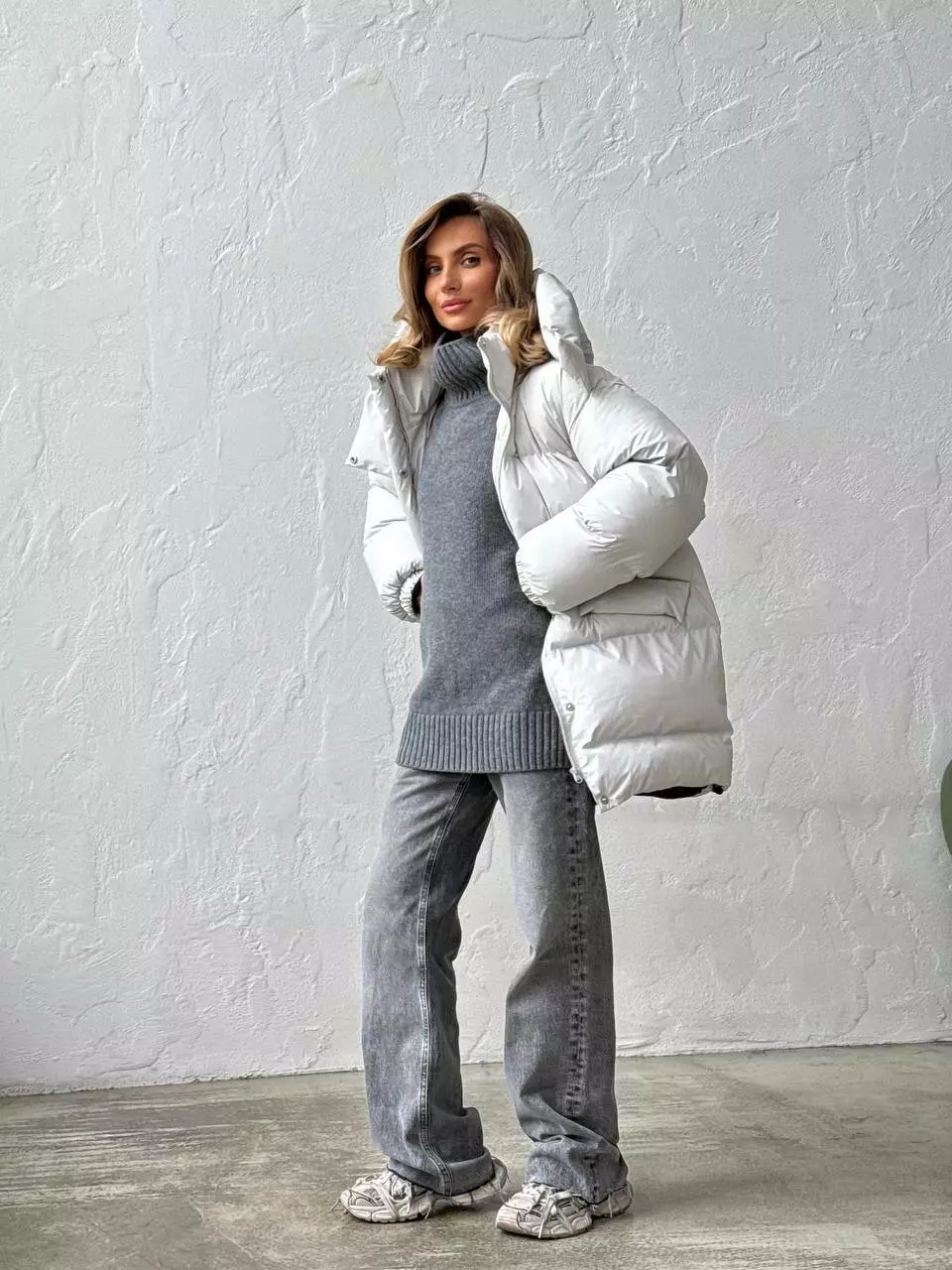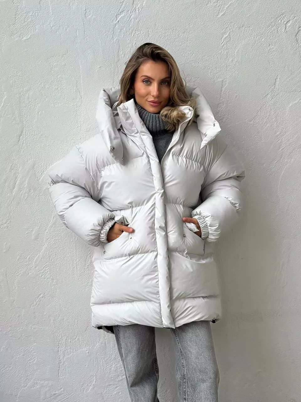 Зимовий подовжений пуховик, виконаний з плащівки на мембрані, що є непродувною і водонепроникаючою. Капюшон знімається