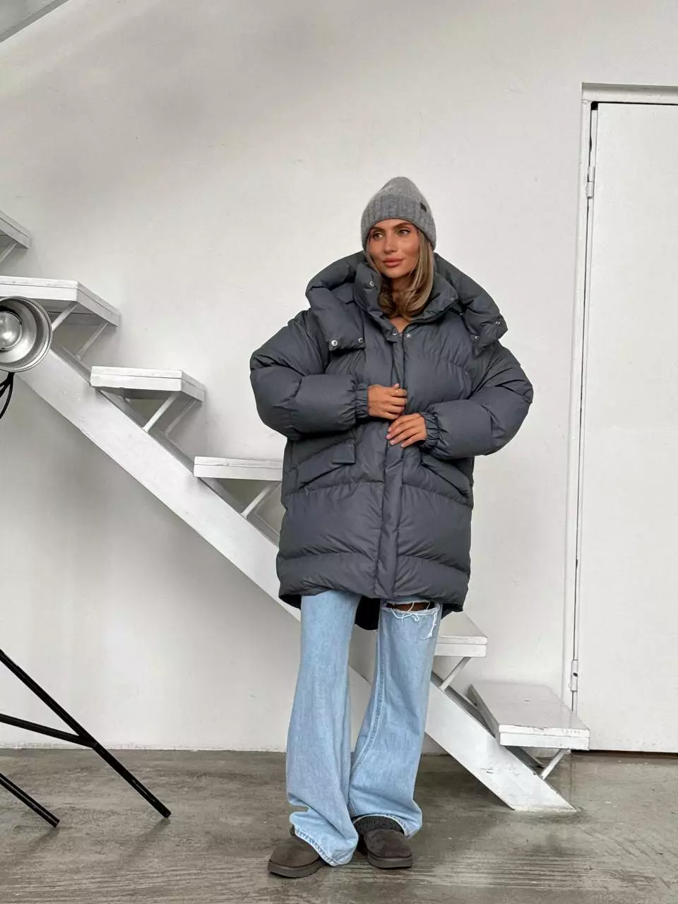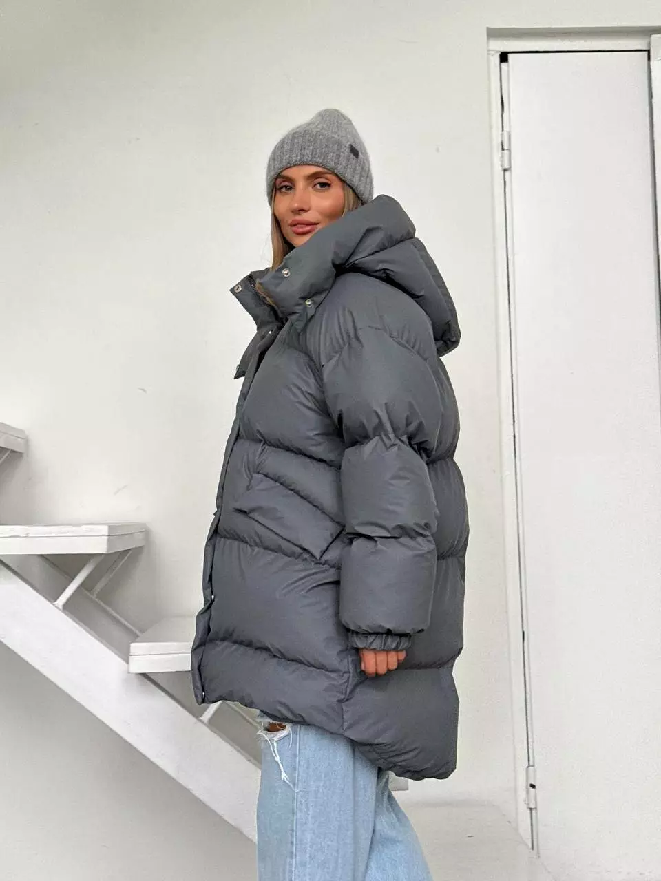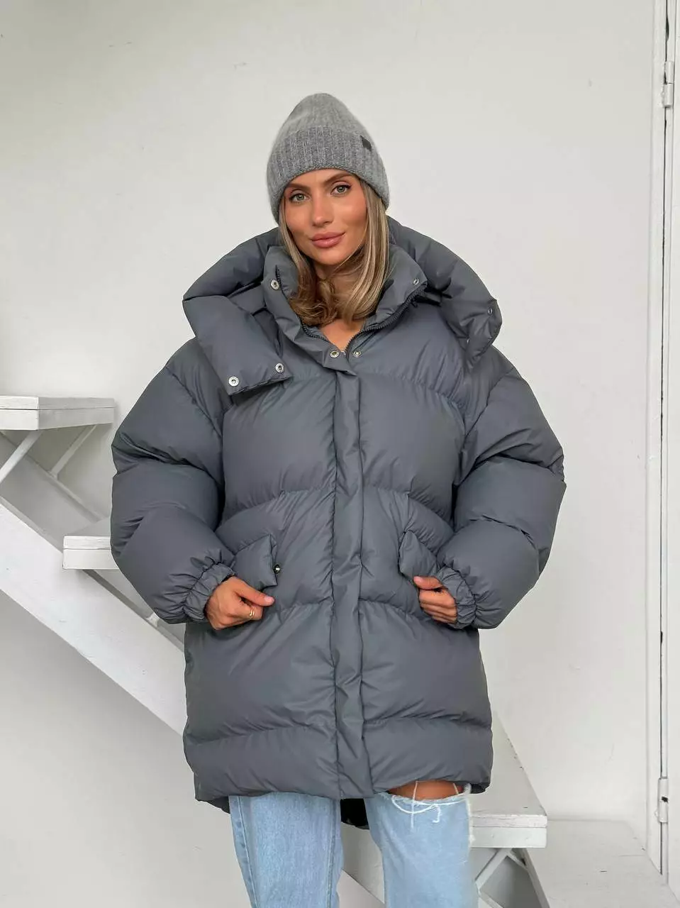 Зимовий подовжений пуховик, виконаний з плащівки на мембрані, що є непродувною і водонепроникаючою. Капюшон знімається