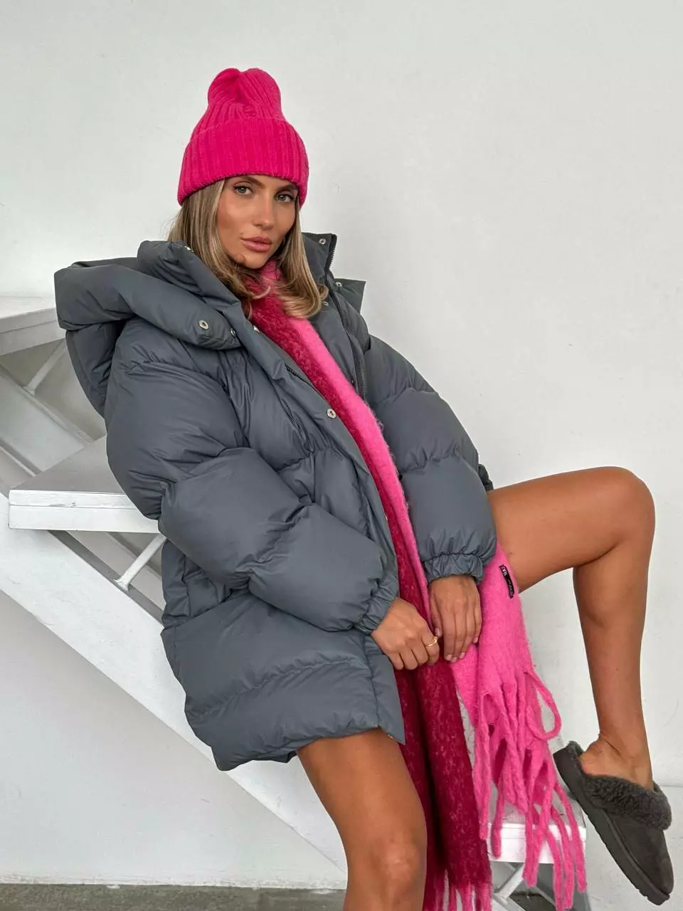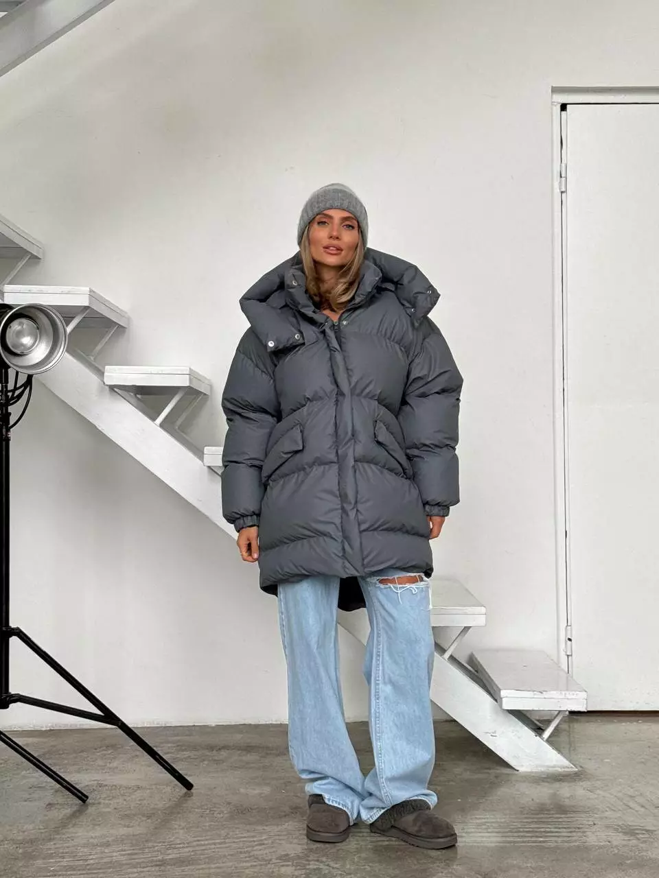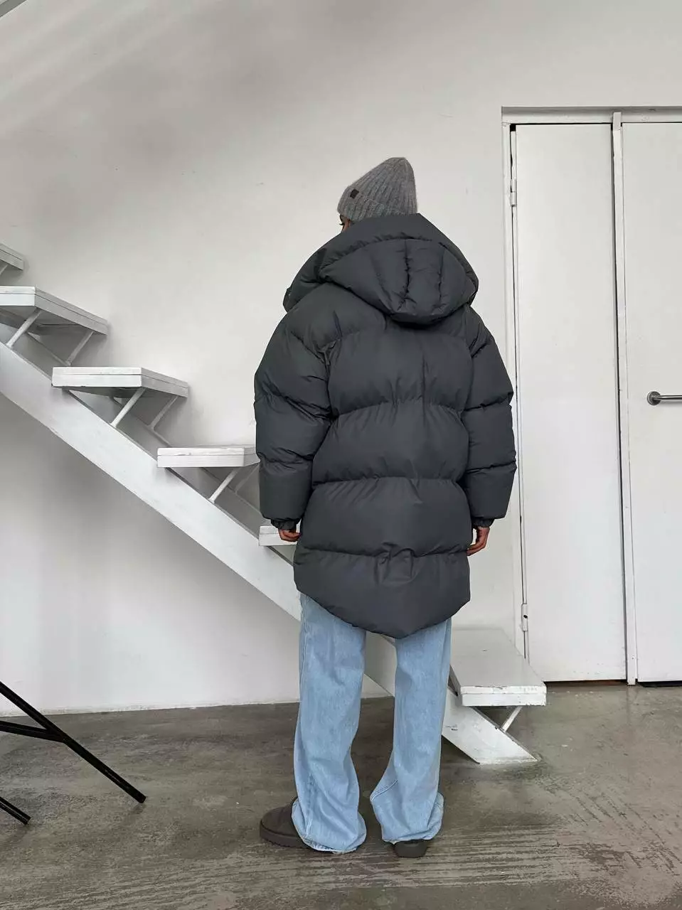Зимовий подовжений пуховик, виконаний з плащівки на мембрані, що є непродувною і водонепроникаючою. Капюшон знімається