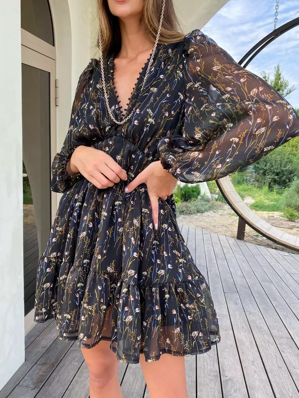 Легка та романтична сукня у квітковий принт має V-подібний виріз та довжину рукава 3/4.