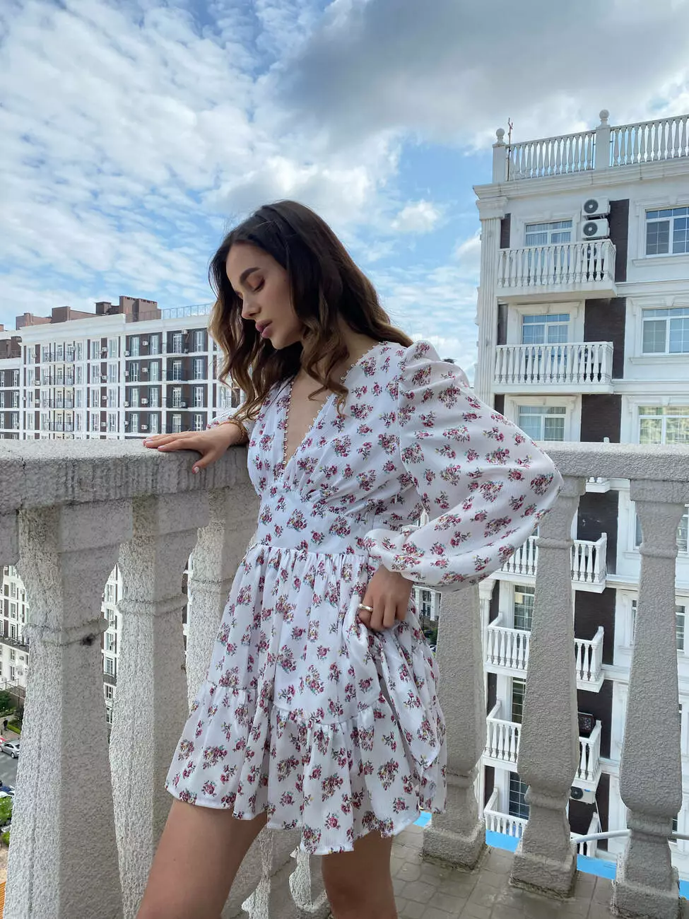 Легка та романтична сукня у квітковий принт має V-подібний виріз та довжину рукава 3/4.