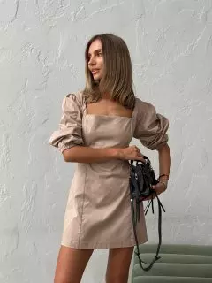 Неймовірно стильна міні сукня з котону з оригінальною спинкою. Чарівності цієї напівприлеглої моделі надають пишні рукави буфи, а також плетіння на відкритій спинці. Бежевий колір виглядає дуже актуальним, підкреслюючи трендовість моделі.