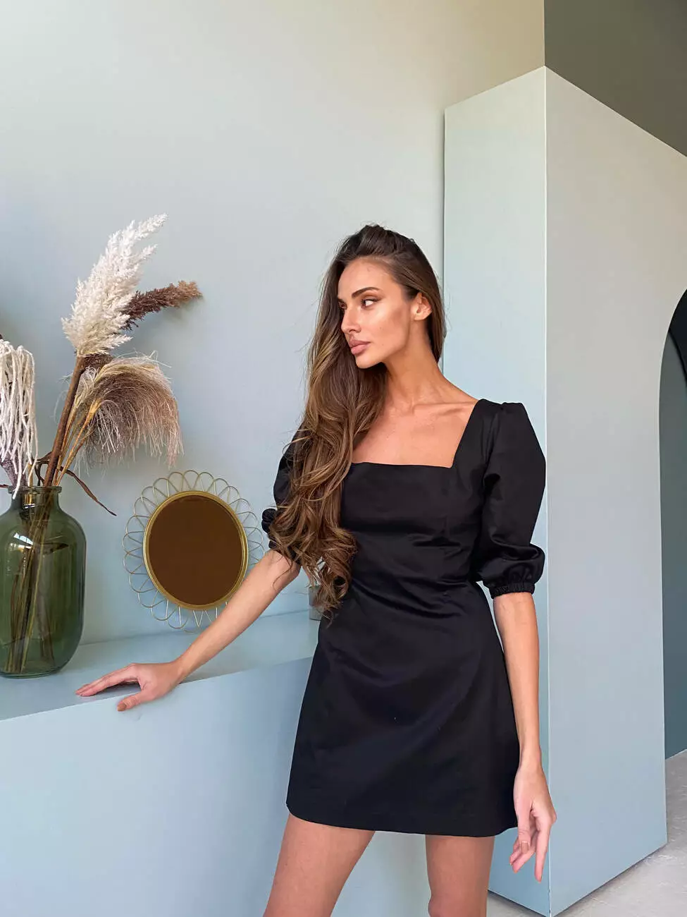 Неймовірно стильна міні сукня з котону з оригінальною спинкою. Чарівності цієї напівприлеглої моделі надають пишні рукави буфи, а також плетіння на відкритій спинці. Бежевий колір виглядає дуже актуальним, підкреслюючи трендовість моделі.