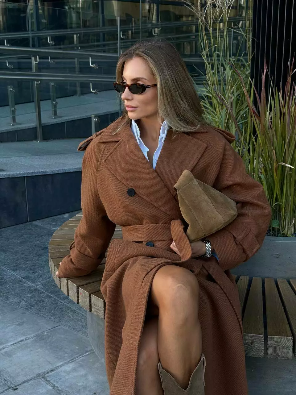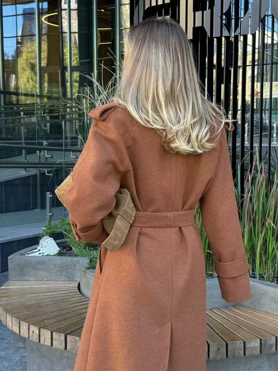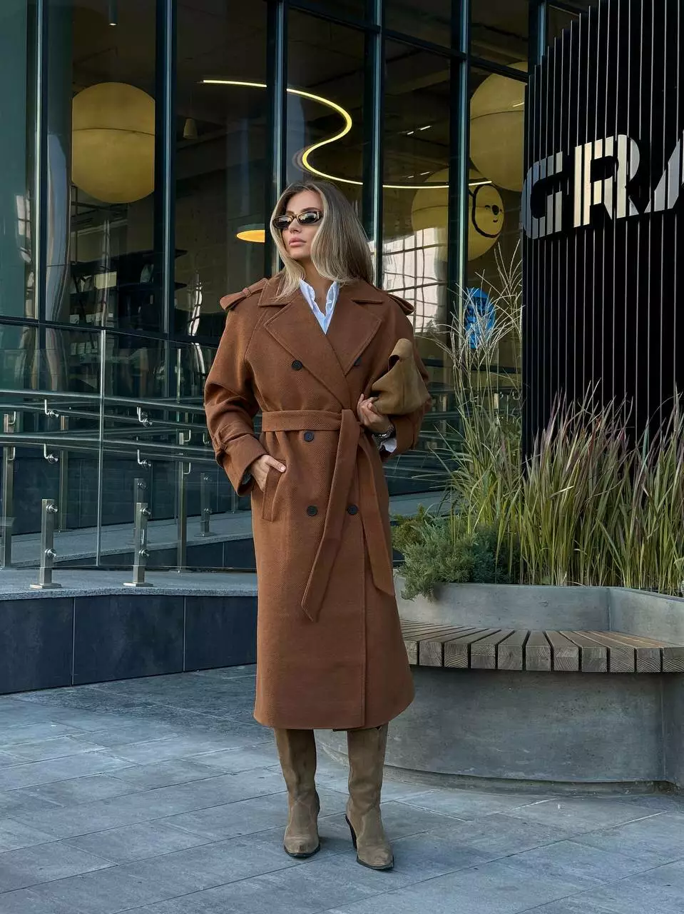 Двобортне оверсайз пальто класичного крою, декороване патами на плечах та рукавах Демісезонне пальто надає трендового об'єму, має 2 діючі кишені та шліцу по спинці внизу Застібається на гудзики, пояс в комплекті