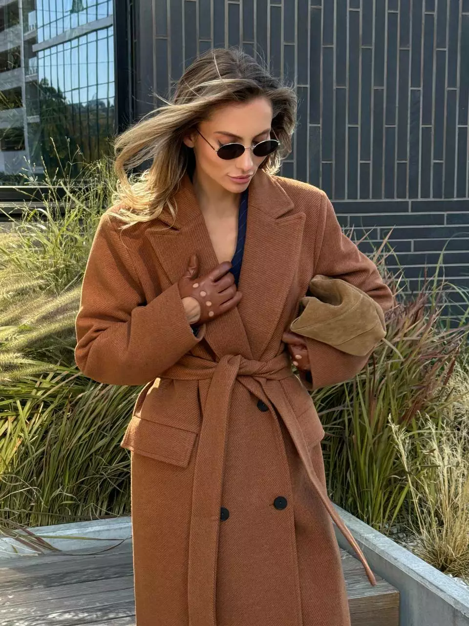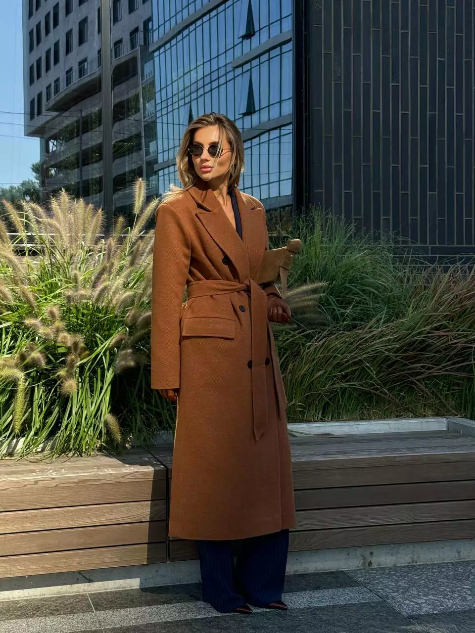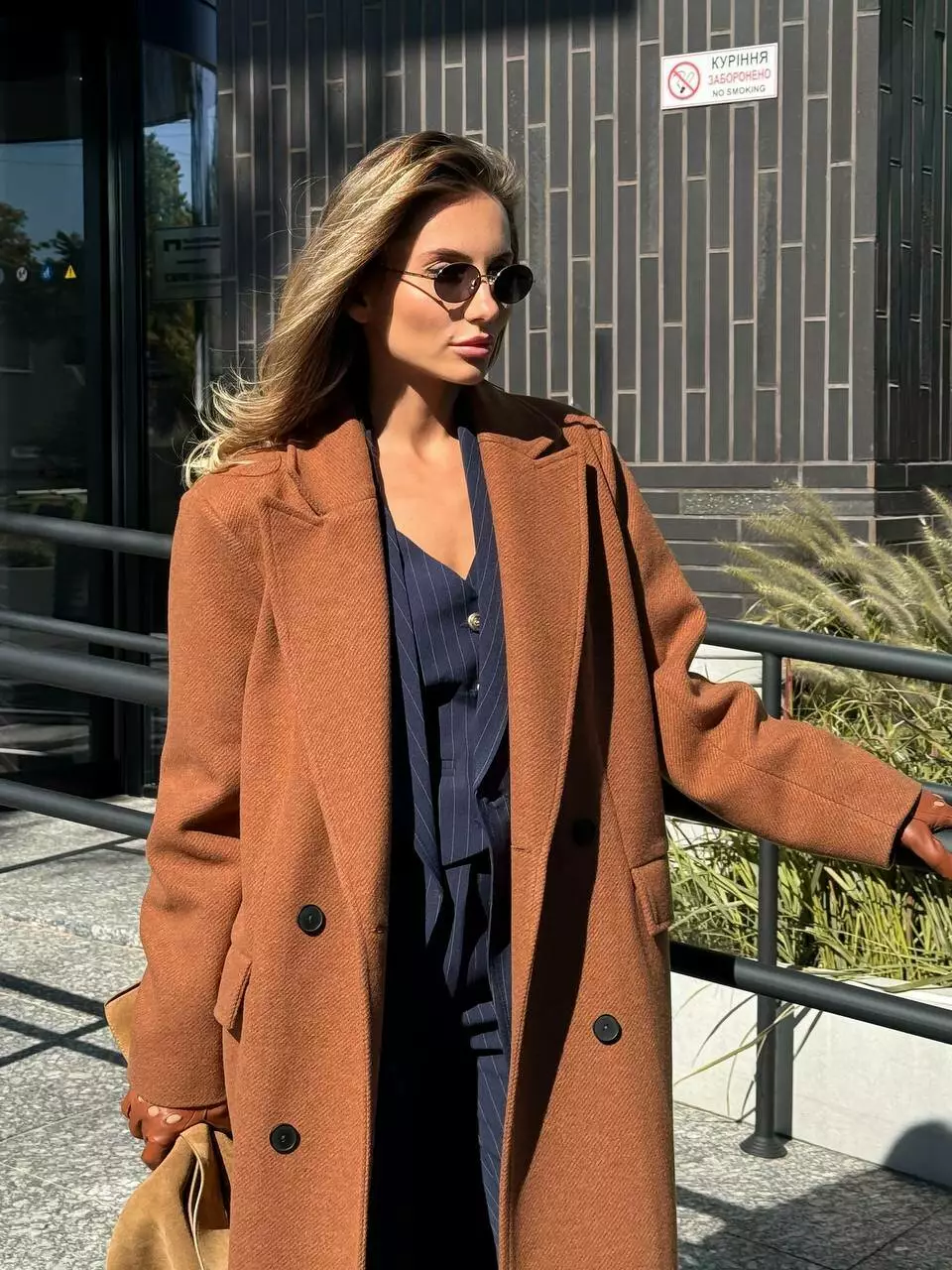 Трендове подовжене двобортне пальто класичного крою з об'ємними плечима Дизайн пальто створений, щоб відчувати себе неймовірно комфортно та впевнено у будь-якій ситуації, 2 діючі кишені та шліца по спинці внизу Застібається на гудзики, пояс в комплекті