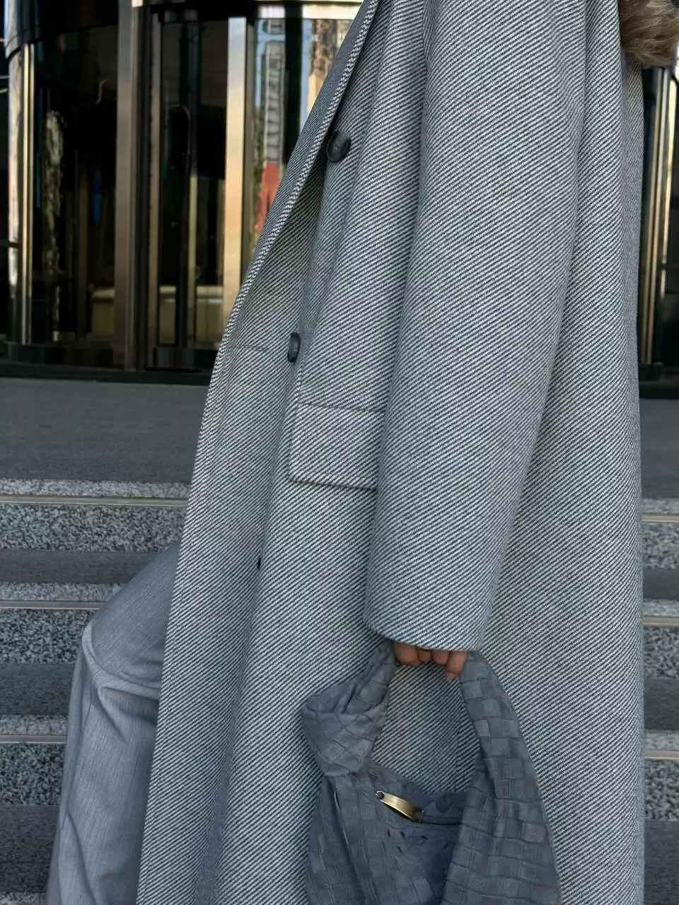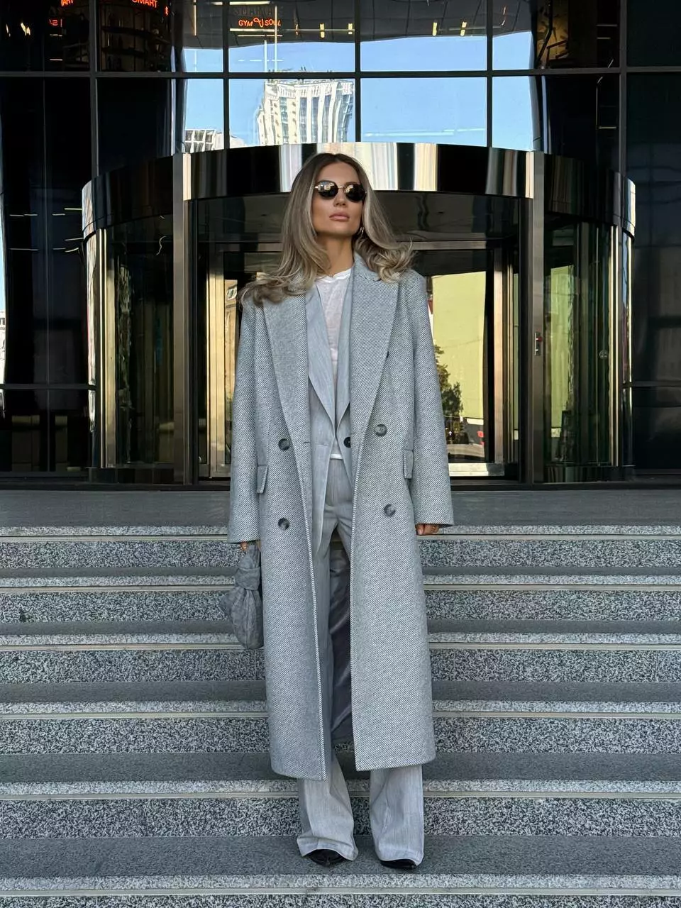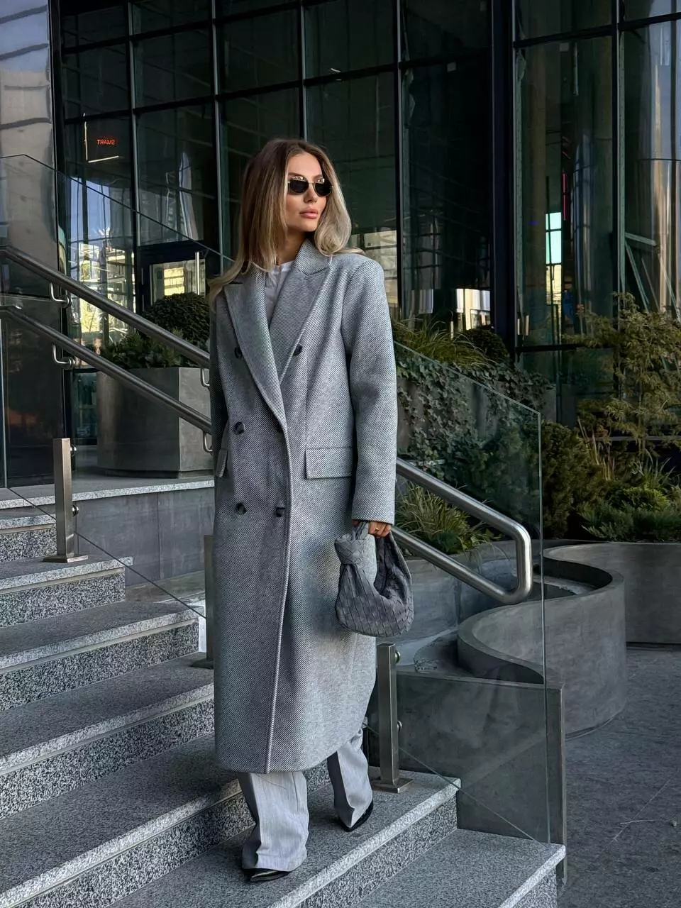 Трендове подовжене двобортне пальто класичного крою з об'ємними плечима Дизайн пальто створений, щоб відчувати себе неймовірно комфортно та впевнено у будь-якій ситуації, 2 діючі кишені та шліца по спинці внизу Застібається на гудзики, пояс в комплекті
