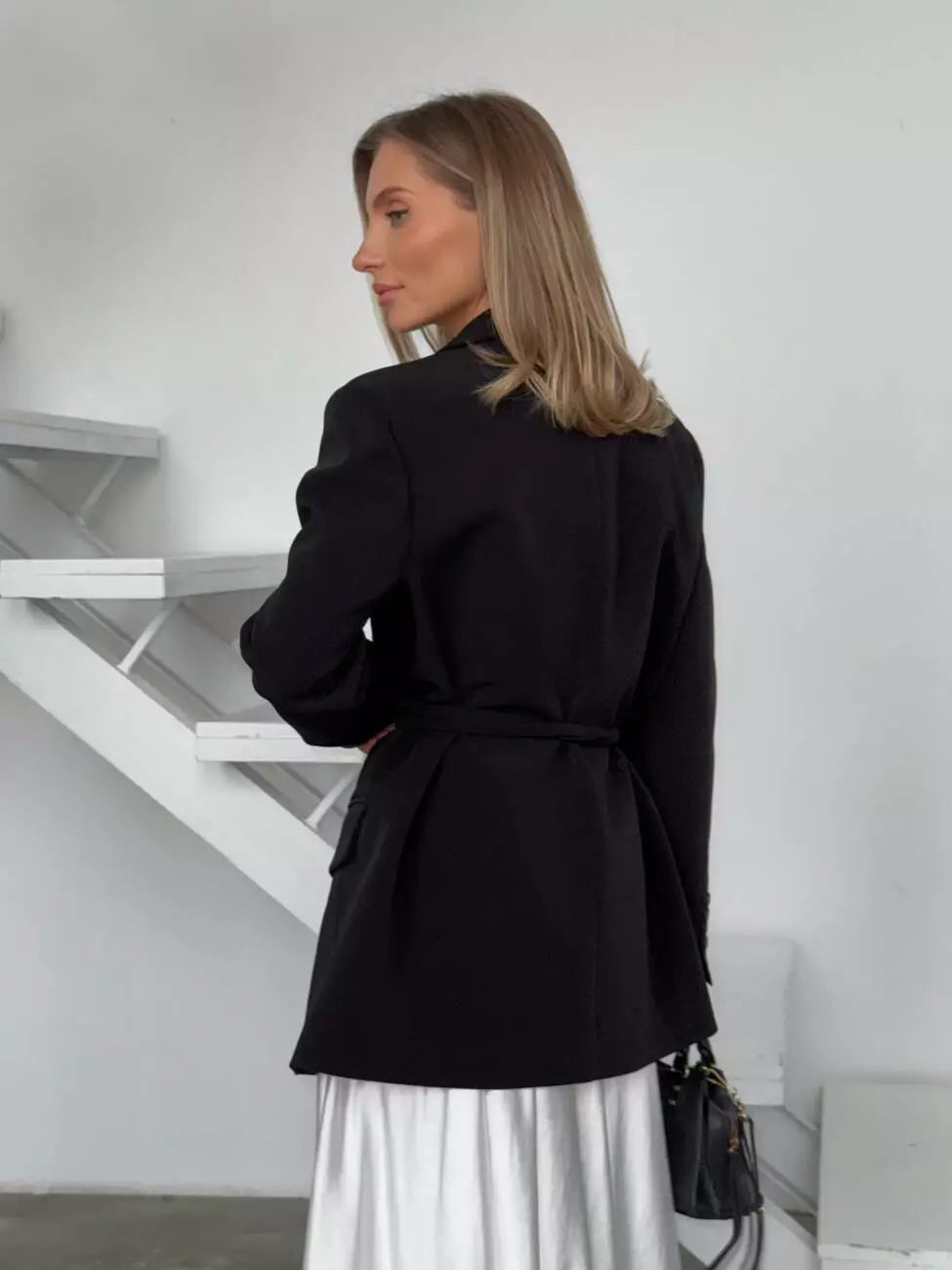 Стильний класичний піджак виконаний із преміальної костюмної тканини. Піджак прямого крою, подовжений, з обʼємними плечима і 2 діючими кармани. В комплекті тонкий пояс -шнурівка.